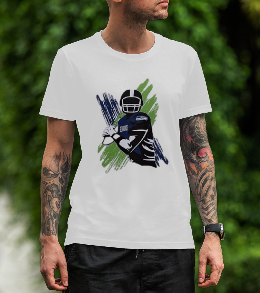 The Seattle Seahawks Starter Player X Blue Green Football T-shirt is designed for everyday wear and a consistent fit. Fabric is pre-shrunk ring-spun cotton with durable stitching. See the size chart below for exact measurements.