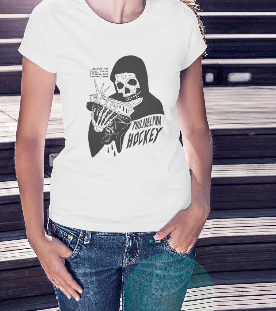 Philadelphia Hockey Beware The Blade Skeleton Holding Skate Only Darkness Is Made T-Shirt