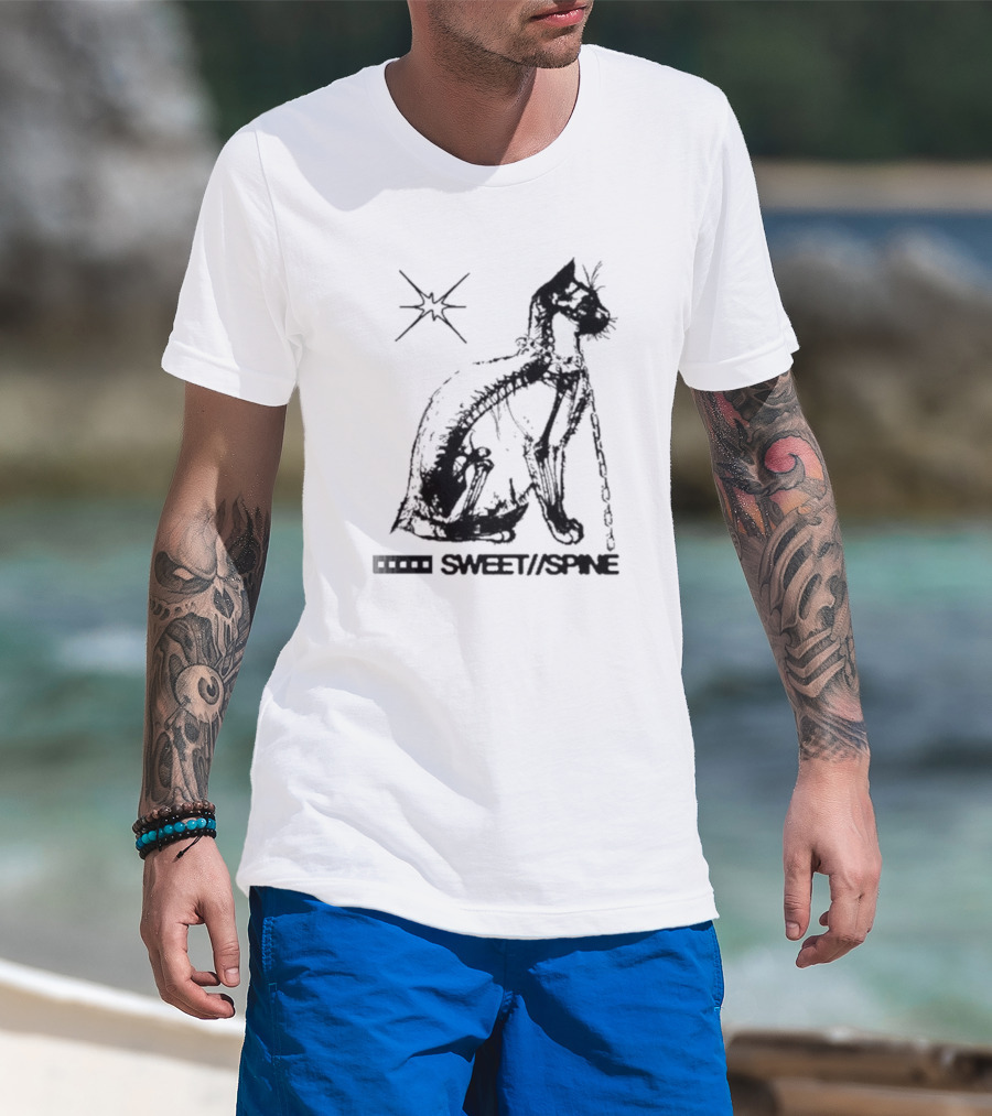 The SWEET//SPINE Cat with Starburst and Chain Detail T-shirt is designed for everyday wear and a consistent fit. Fabric is pre-shrunk ring-spun cotton with durable stitching. See the size chart below for exact measurements.