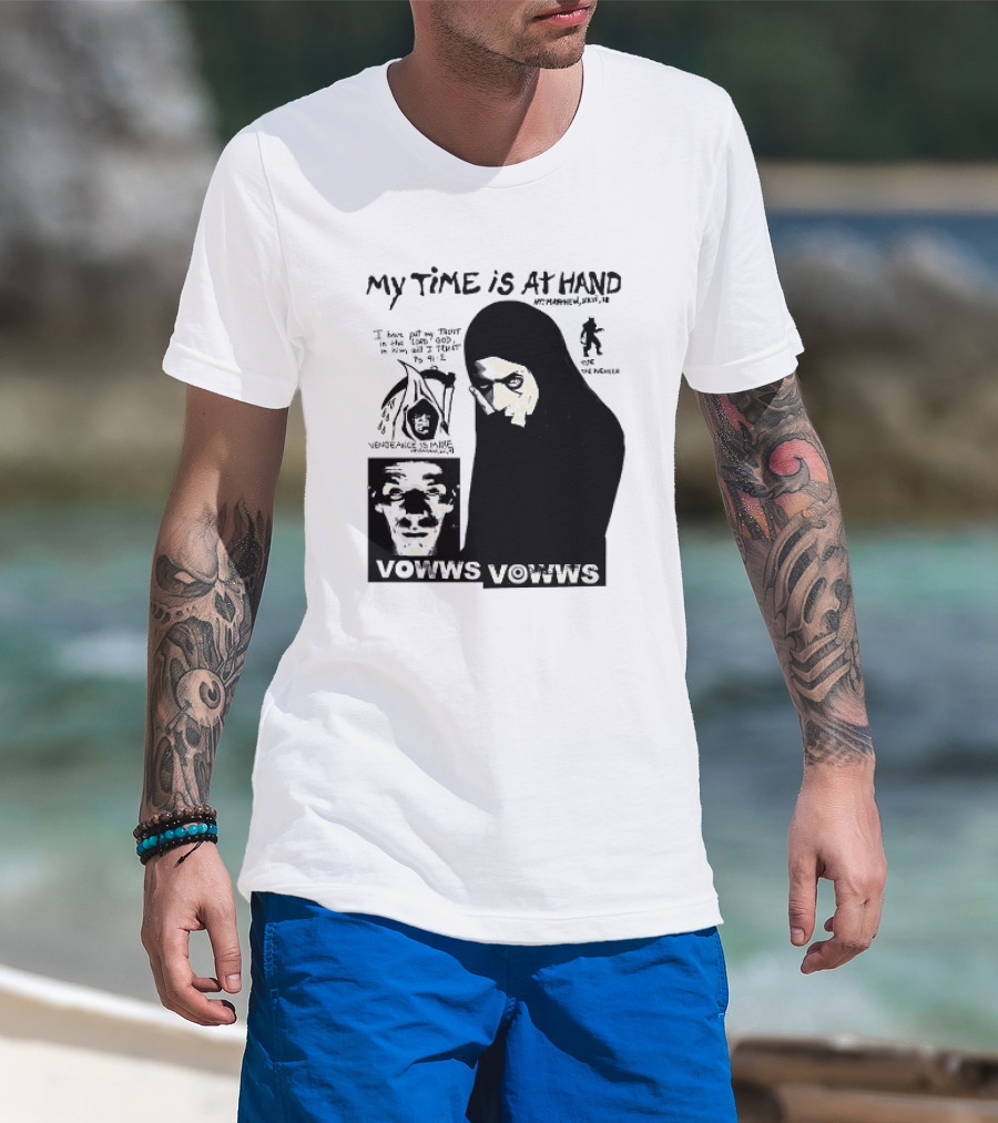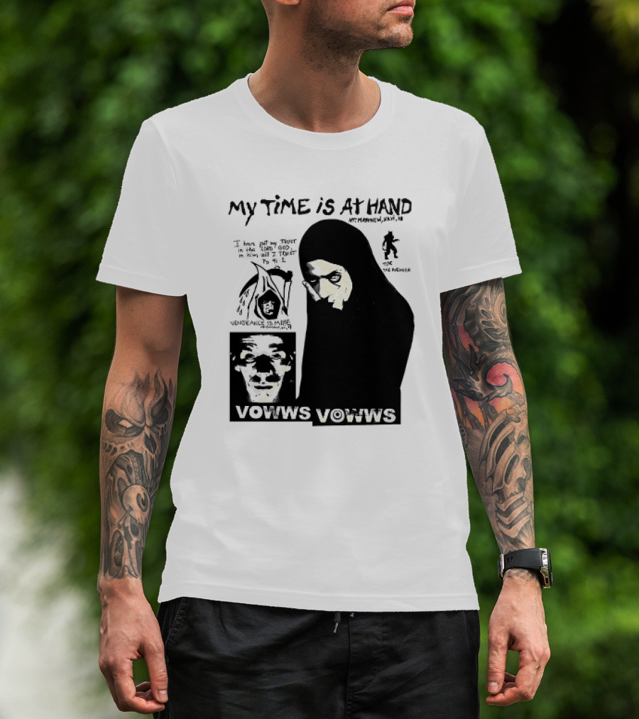 The Vowws My Time is at Hand Matthew XVIII 18 Vengeance is Mine For the Sinner T-shirt is designed for everyday wear and a consistent fit. Fabric is pre-shrunk ring-spun cotton with durable stitching. See the size chart below for exact measurements.