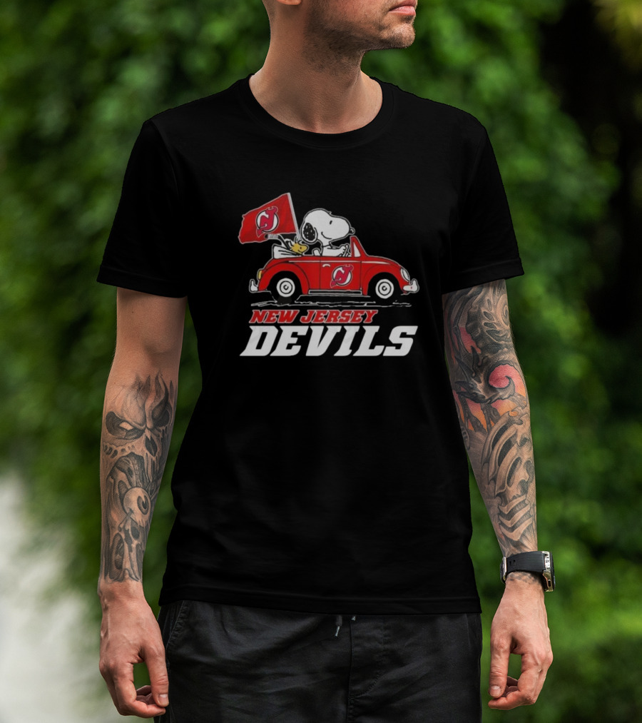 Snoopy And Woodstock Driving Car With New Jersey Devils Flag T-Shirt