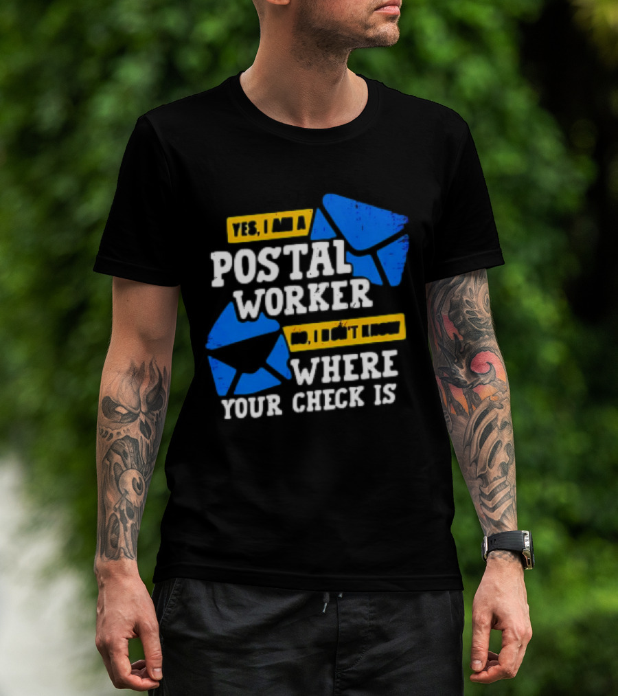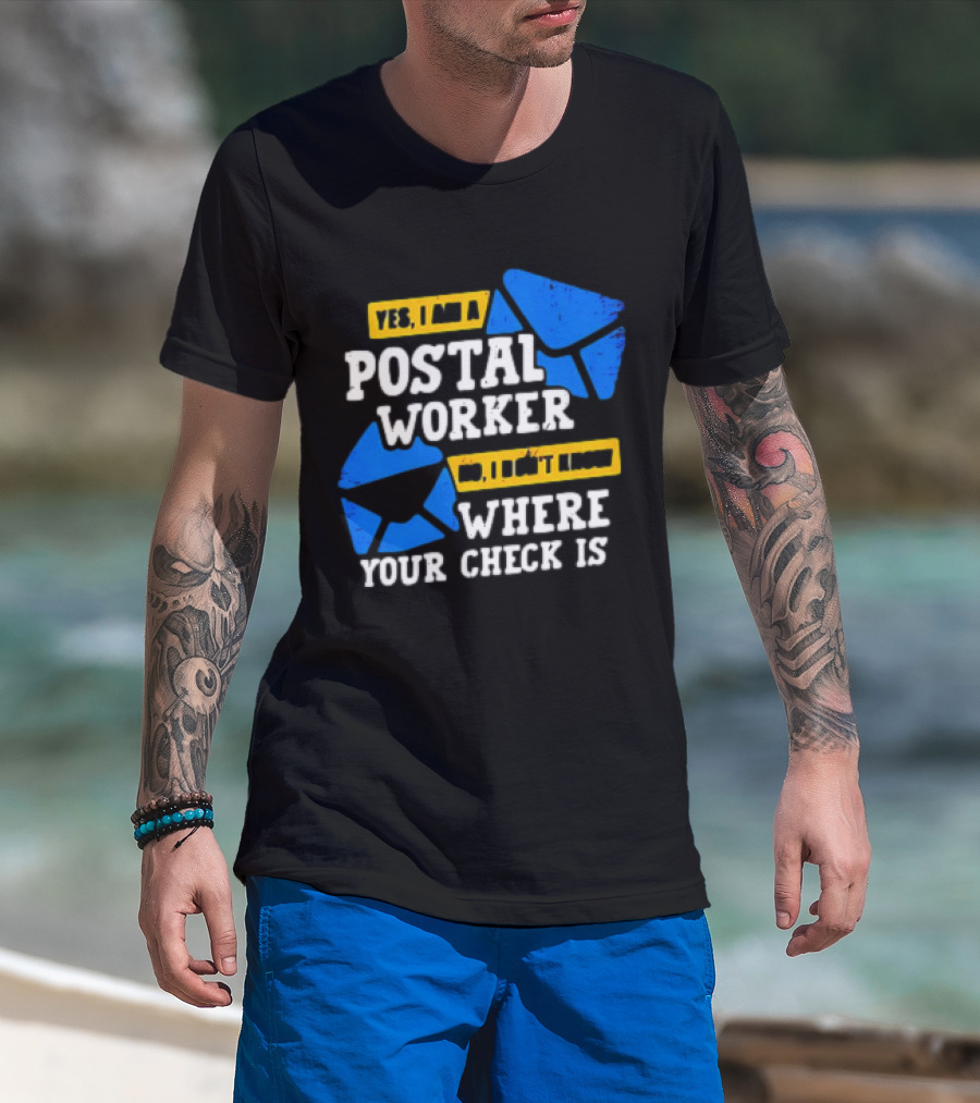 Yes I Am A Postal Worker No I Don’t Know Where Your Check Is Blue Envelopes T-Shirt