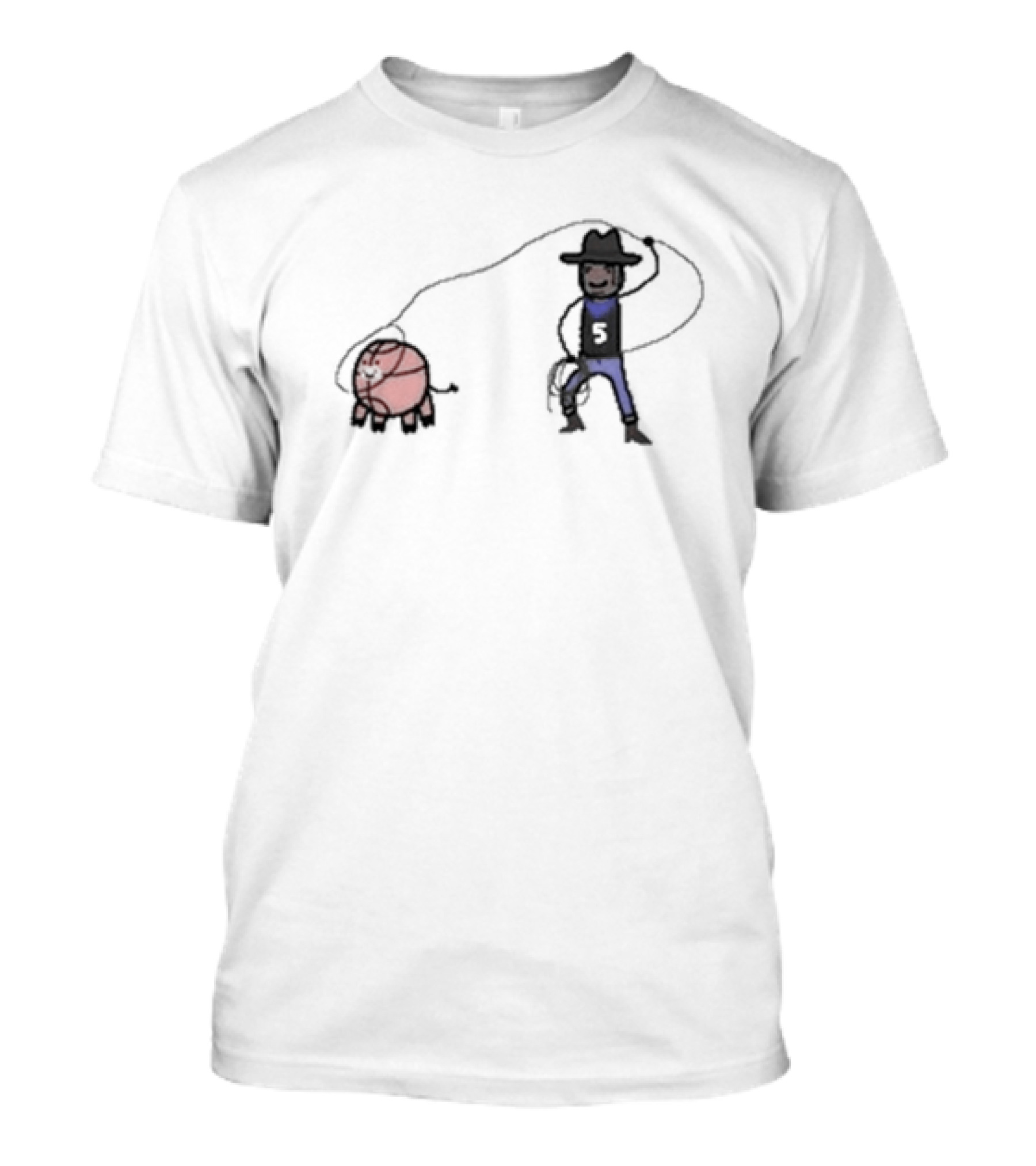 The Paolo Ranch-Ero Cowboy Basketball Number 5 T-shirt is designed for everyday wear and a consistent fit. Fabric is pre-shrunk ring-spun cotton with durable stitching. See the size chart below for exact measurements.