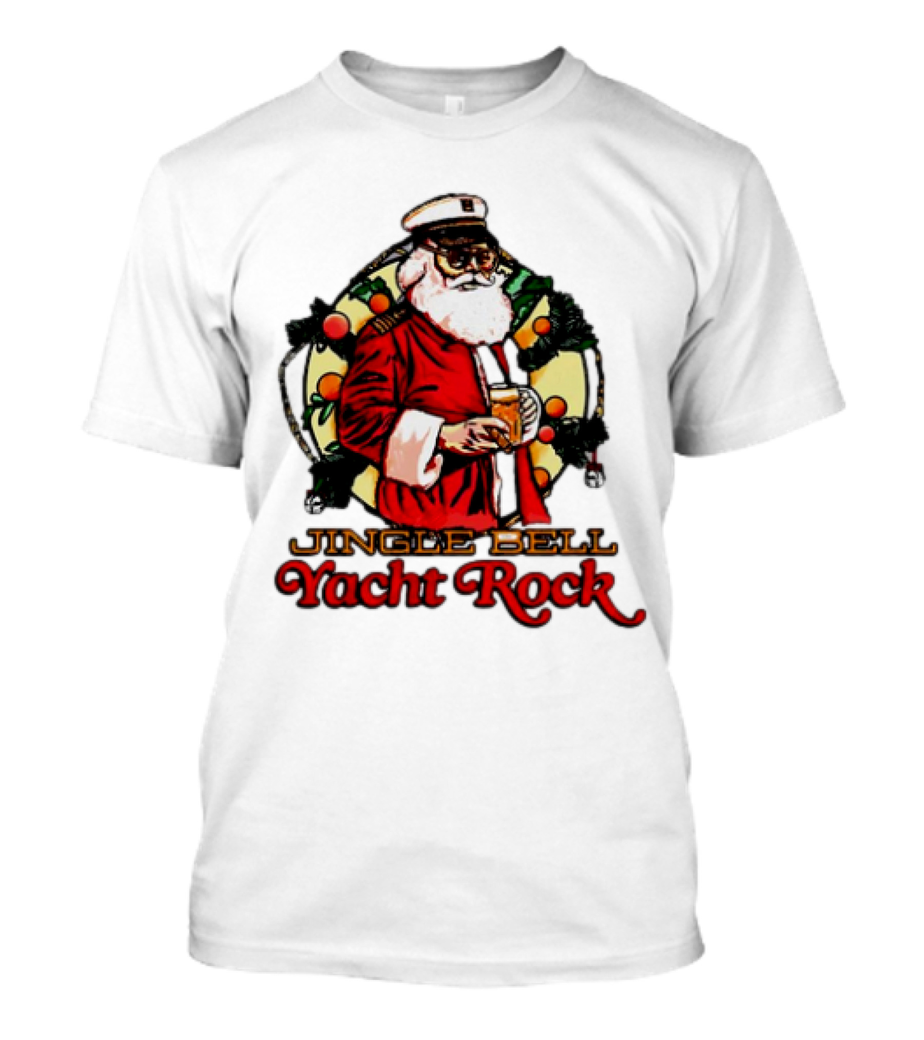 The Jingle Bell Yacht Rock Santa Christmas T-shirt is designed for everyday wear and a consistent fit. Fabric is pre-shrunk ring-spun cotton with durable stitching. See the size chart below for exact measurements.