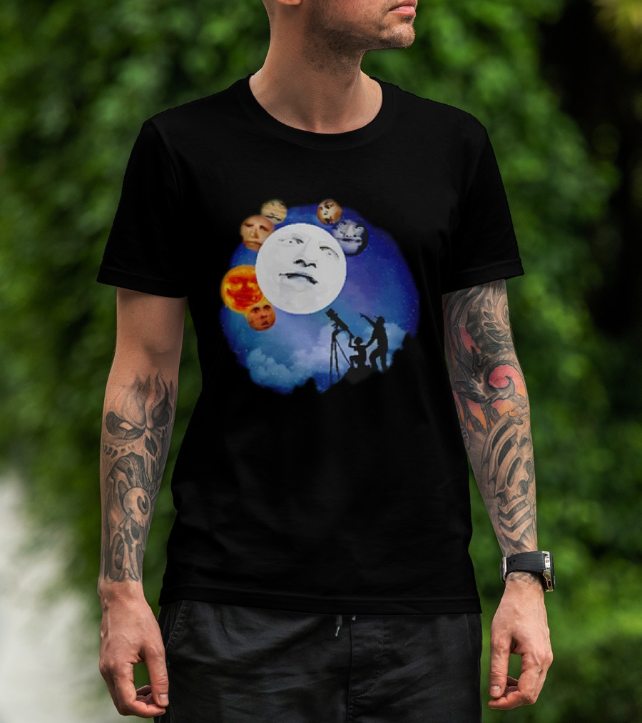 Man And Child Stargazing At Moon And Face Planets T-Shirt