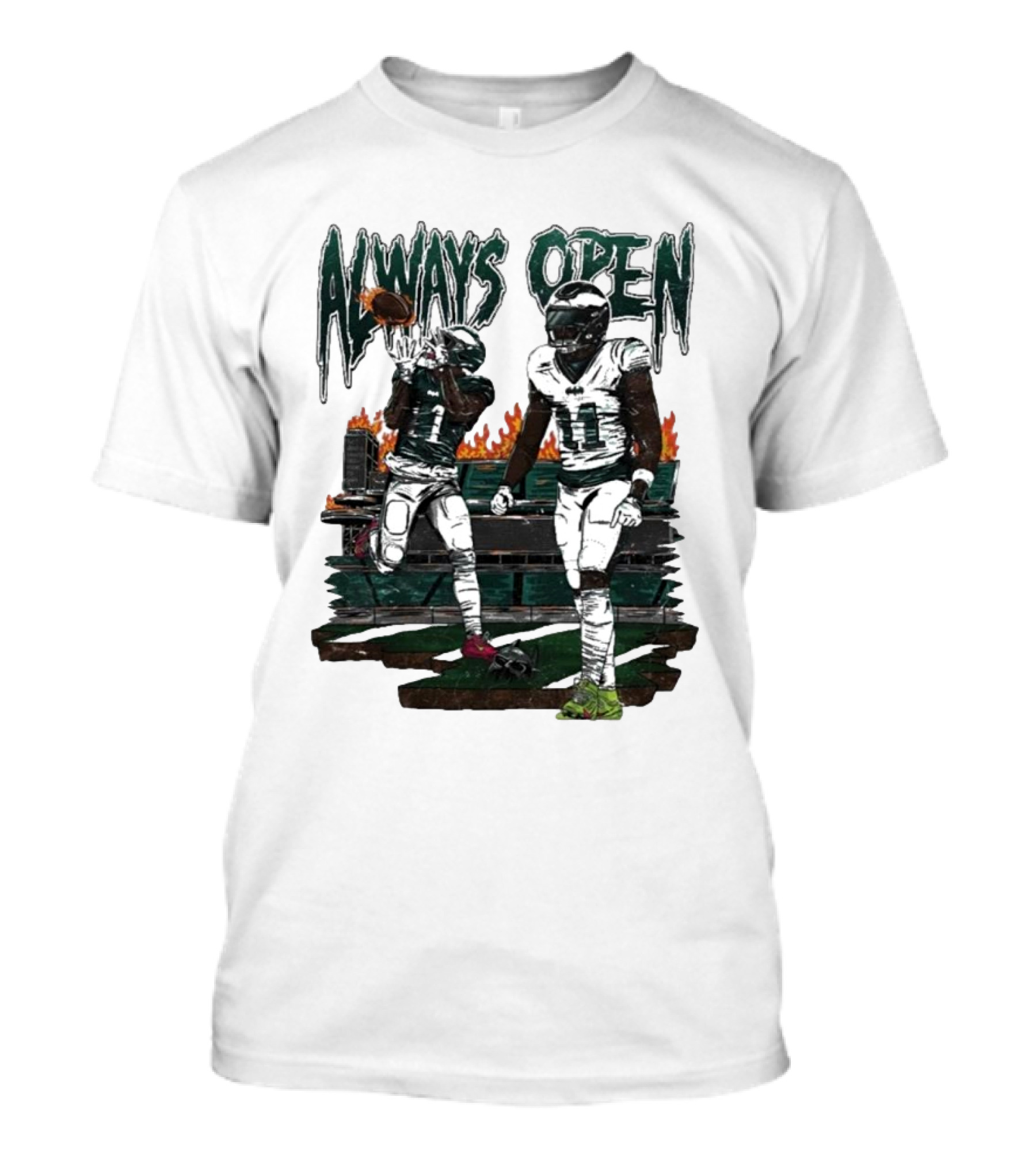 The Jalen Hurts AJ Brown Always Open Football Iconic Play T-shirt is designed for everyday wear and a consistent fit. Fabric is pre-shrunk ring-spun cotton with durable stitching. See the size chart below for exact measurements.
