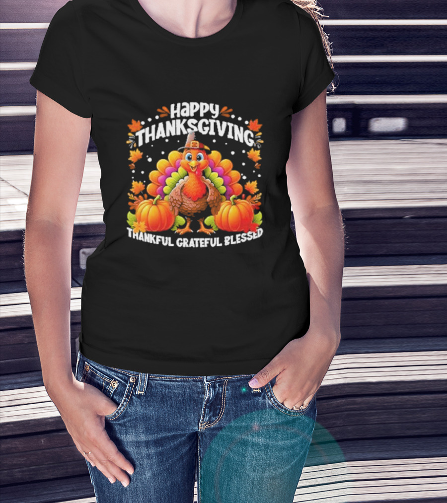 Happy Thanksgiving Turkey Thankful Grateful Blessed With Pumpkins And Autumn Leaves T-Shirt
