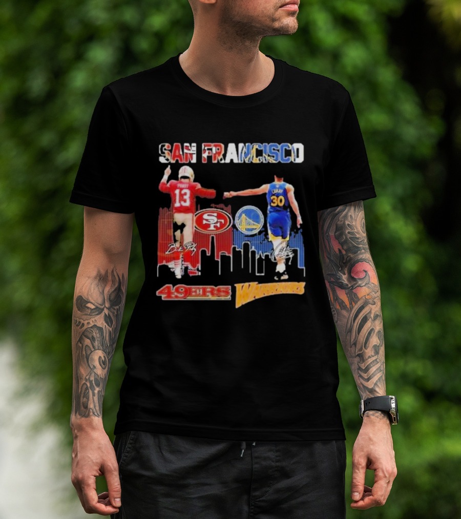 San Francisco 49ers Golden State Warriors Signatures With San Francisco Skyline T-Shirt