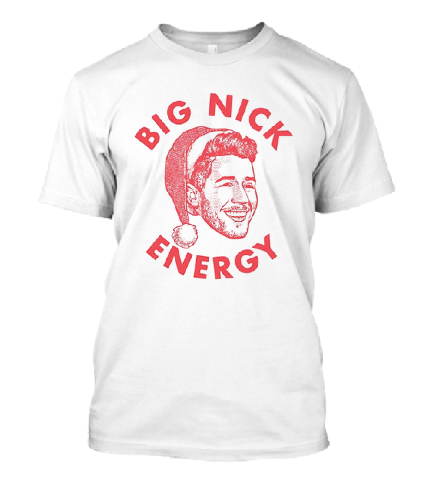 The Jonas Brothers Big Nick Energy Christmas Hat T-shirt is designed for everyday wear and a consistent fit. Fabric is pre-shrunk ring-spun cotton with durable stitching. See the size chart below for exact measurements.