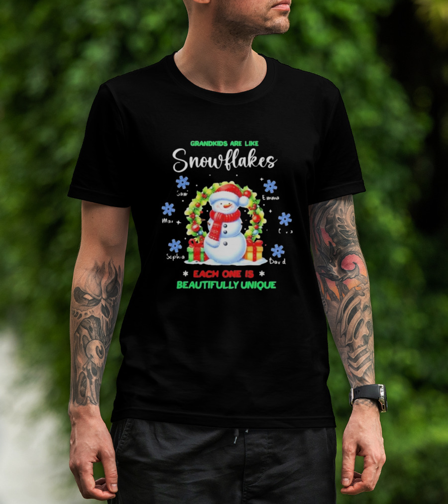 Grandkids Are Like Snowflakes Each One Is Beautifully Unique Christmas Personalized Names Snowman Wreath T-Shirt