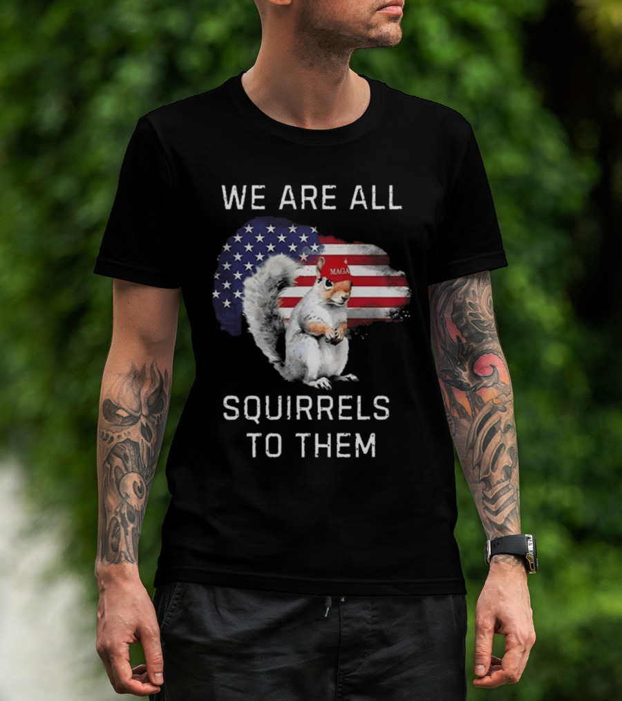 Squirrel With MAGA Hat In Front Of American Flag We Are All Squirrels To Them T-Shirt