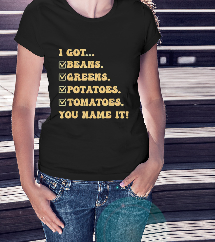 The I Got Beans Greens Potatoes Tomatoes You Name It Checkboxes T-shirt is designed for everyday wear and a consistent fit. Fabric is pre-shrunk ring-spun cotton with durable stitching. See the size chart below for exact measurements.