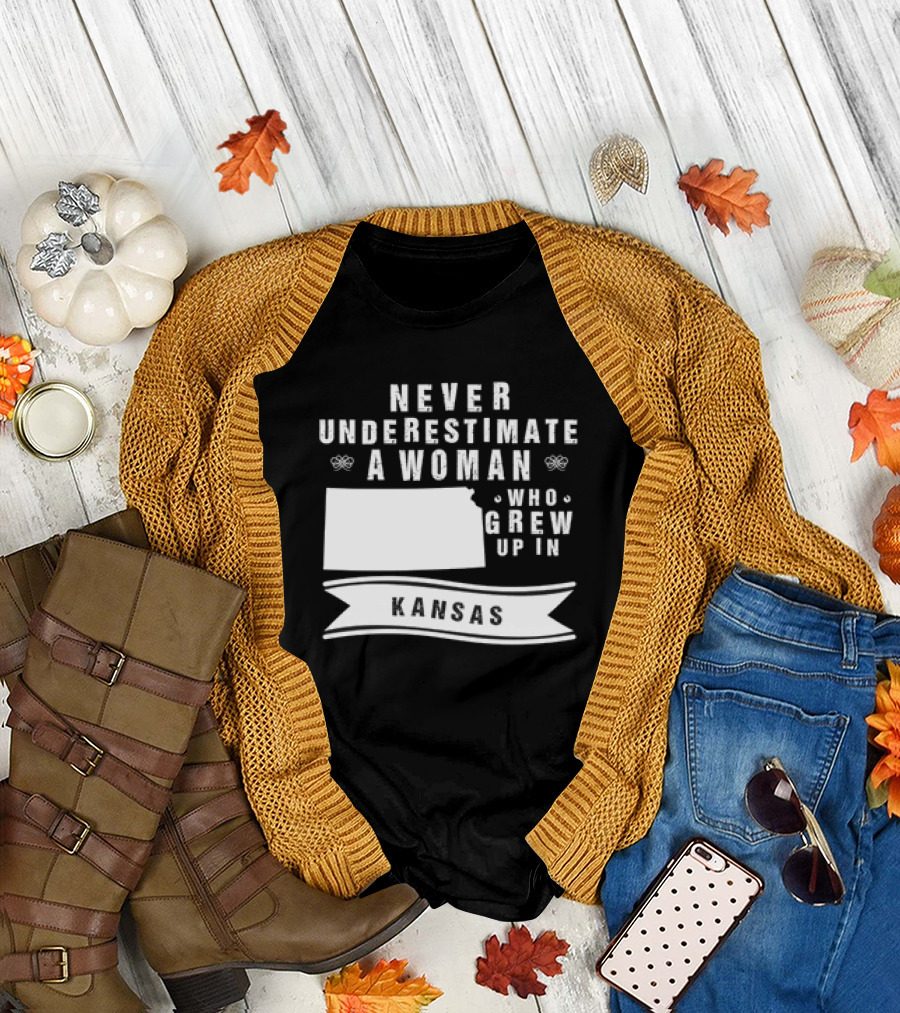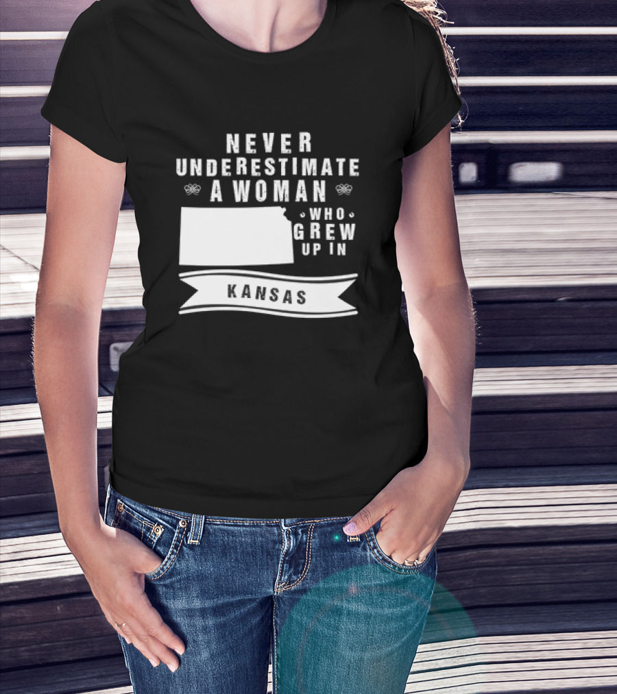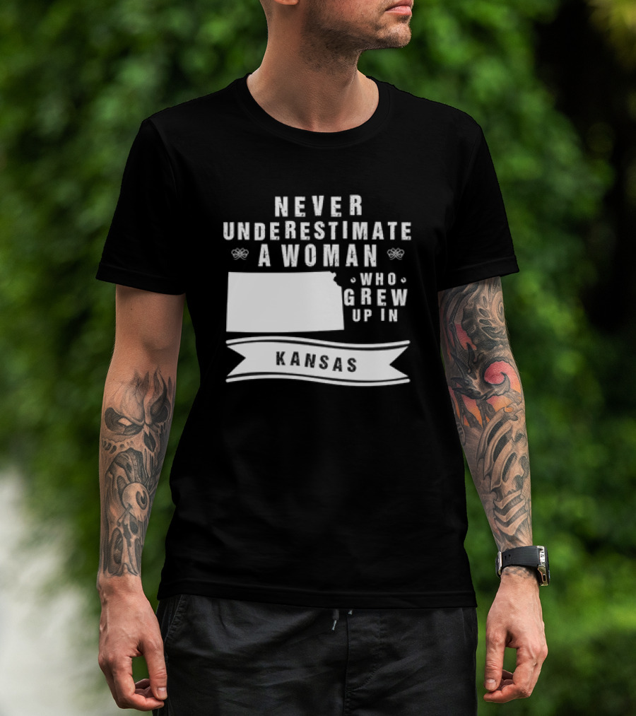 Never Underestimate A Woman Who Grew Up In Kansas With State Outline And Banner T-Shirt