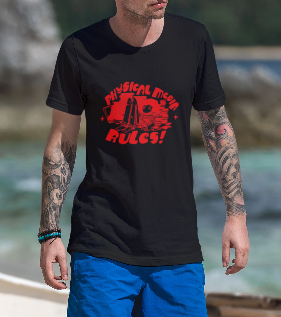 The Lid The Kid Physical Media Rules Retro Classic Stack T-shirt is designed for everyday wear and a consistent fit. Fabric is pre-shrunk ring-spun cotton with durable stitching. See the size chart below for exact measurements.