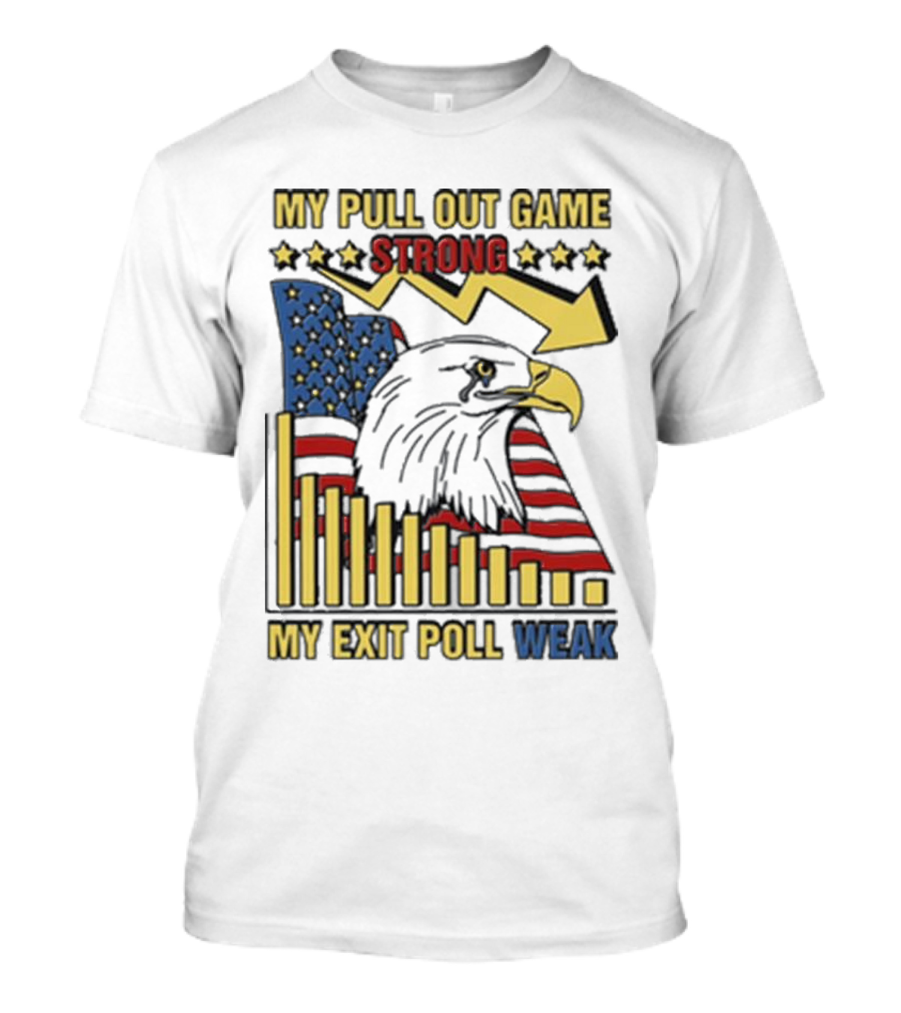 The Patriotic Eagle with American Flag and Humor on Pull Out Game and Exit Poll Strength T-shirt is designed for everyday wear and a consistent fit. Fabric is pre-shrunk ring-spun cotton with durable stitching. See the size chart below for exact measurements.