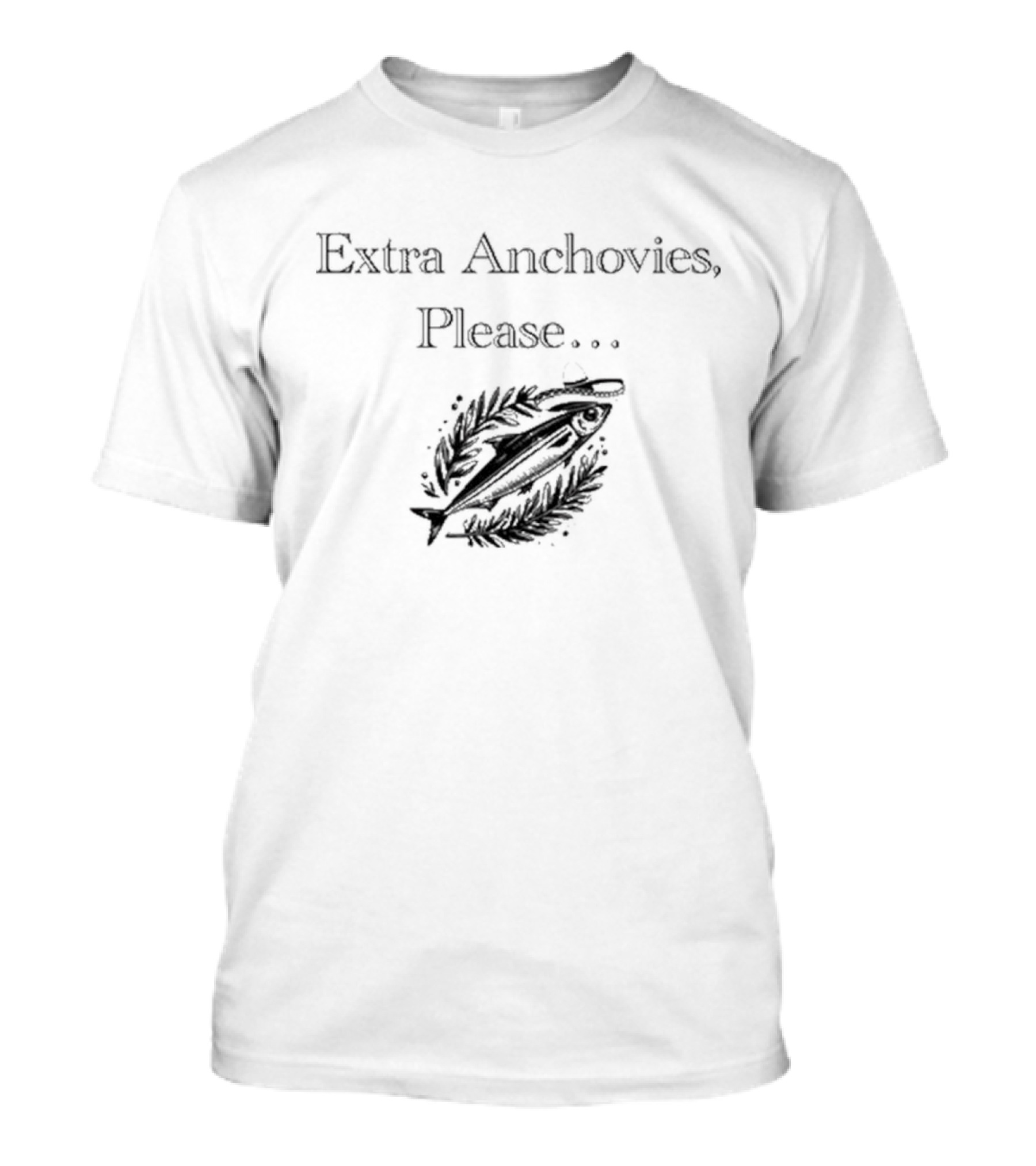 The Sarah Michelle Gellar Extra Anchovies Please Fish T-shirt is designed for everyday wear and a consistent fit. Fabric is pre-shrunk ring-spun cotton with durable stitching. See the size chart below for exact measurements.