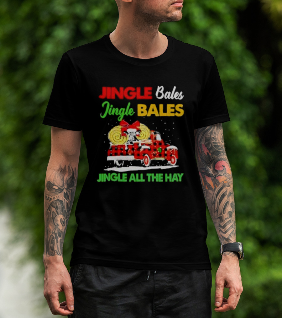 Jingle Bales Jingle Bales Jingle All The Hay With Red Plaid Truck And Christmas Hay Bales T-Shirt