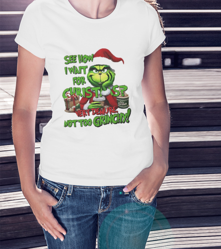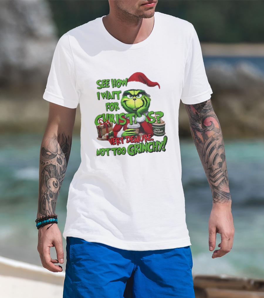 See How I Wait For Christmas Very Demure Not Too Grinchy With Santa Hat And Gifts T-Shirt