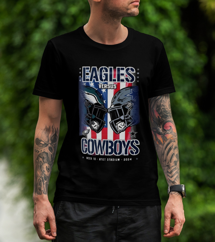 The Eagles Versus Cowboys Week 10 AT&T Stadium T-shirt is designed for everyday wear and a consistent fit. Fabric is pre-shrunk ring-spun cotton with durable stitching. See the size chart below for exact measurements.