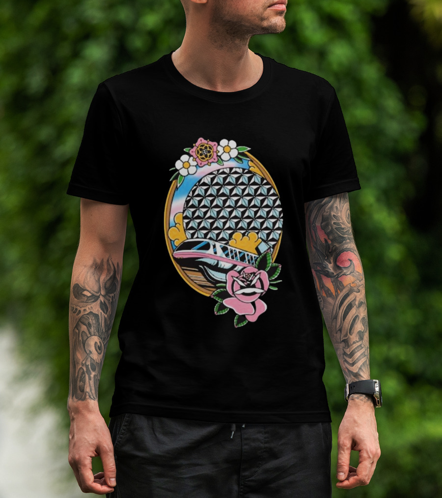 The Lost Bros Monorail Spaceship Earth Tattoo Style Floral T-Shirt