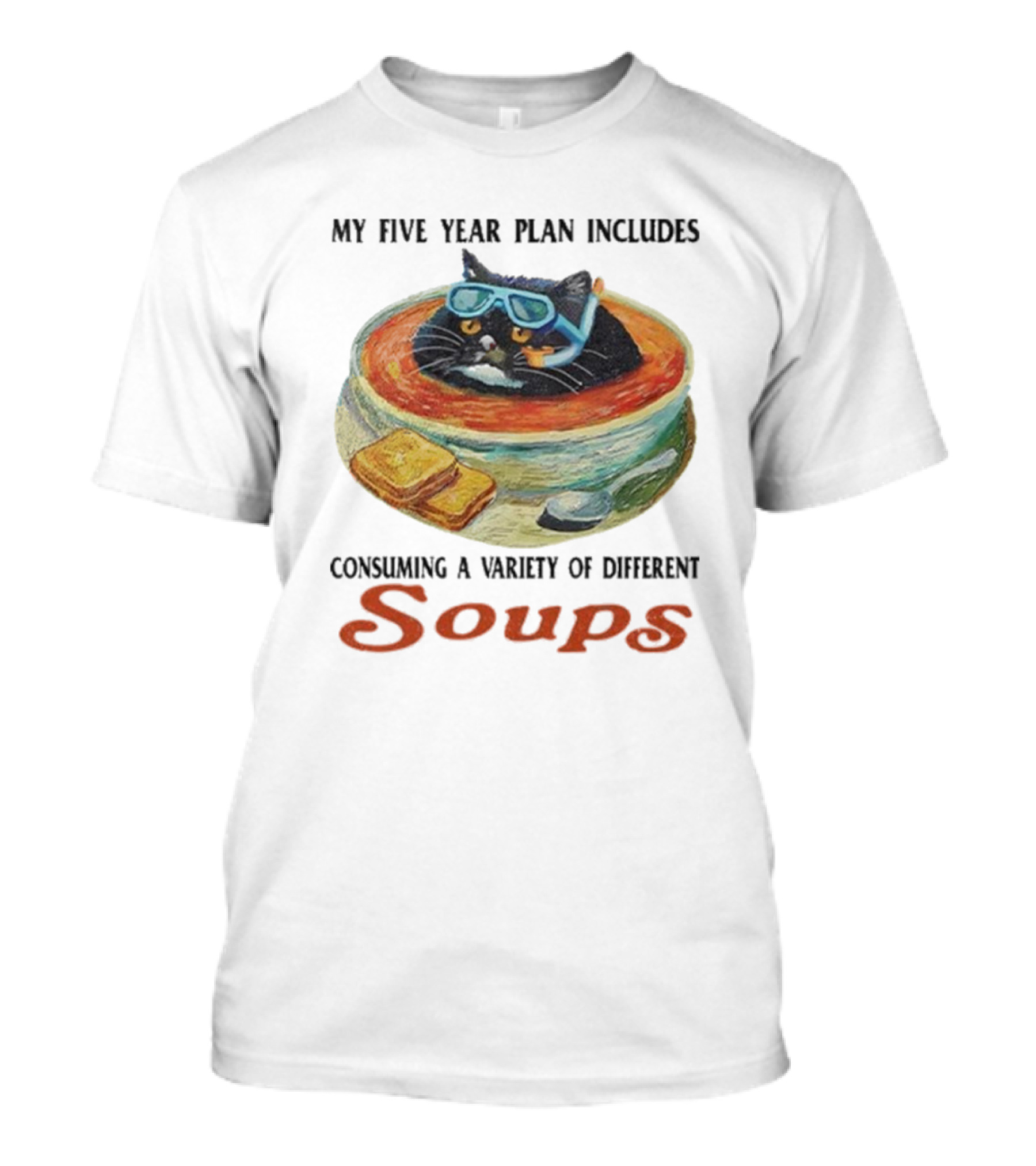 The My Five Year Plan Includes Consuming A Variety Of Different Soups Cat Wearing Goggles In Bowl With Bread T-shirt is designed for everyday wear and a consistent fit. Fabric is pre-shrunk ring-spun cotton with durable stitching. See the size chart below for exact measurements.