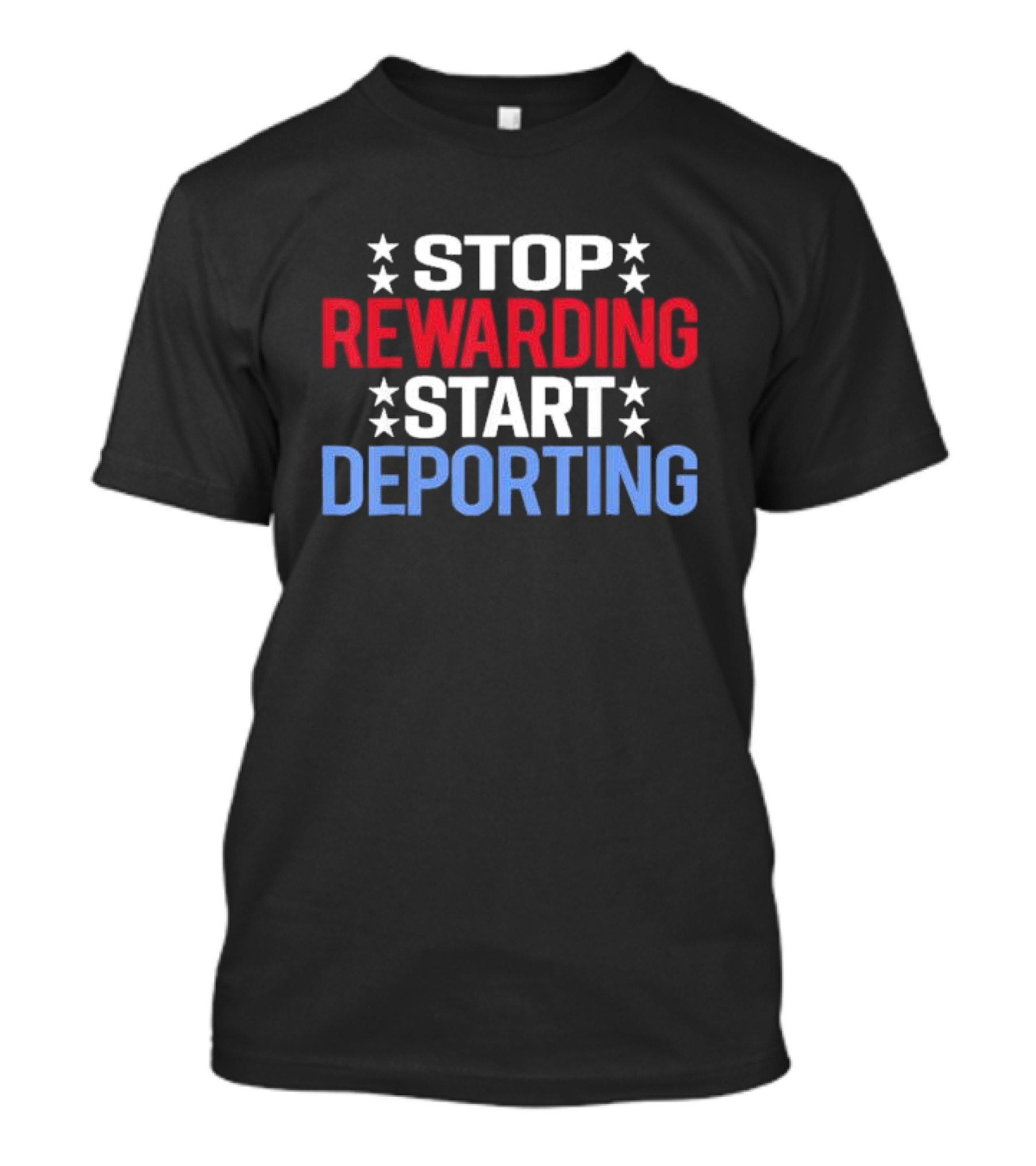 The Stop Rewarding Start Deporting Stars Red White Blue T-shirt is designed for everyday wear and a consistent fit. Fabric is pre-shrunk ring-spun cotton with durable stitching. See the size chart below for exact measurements.