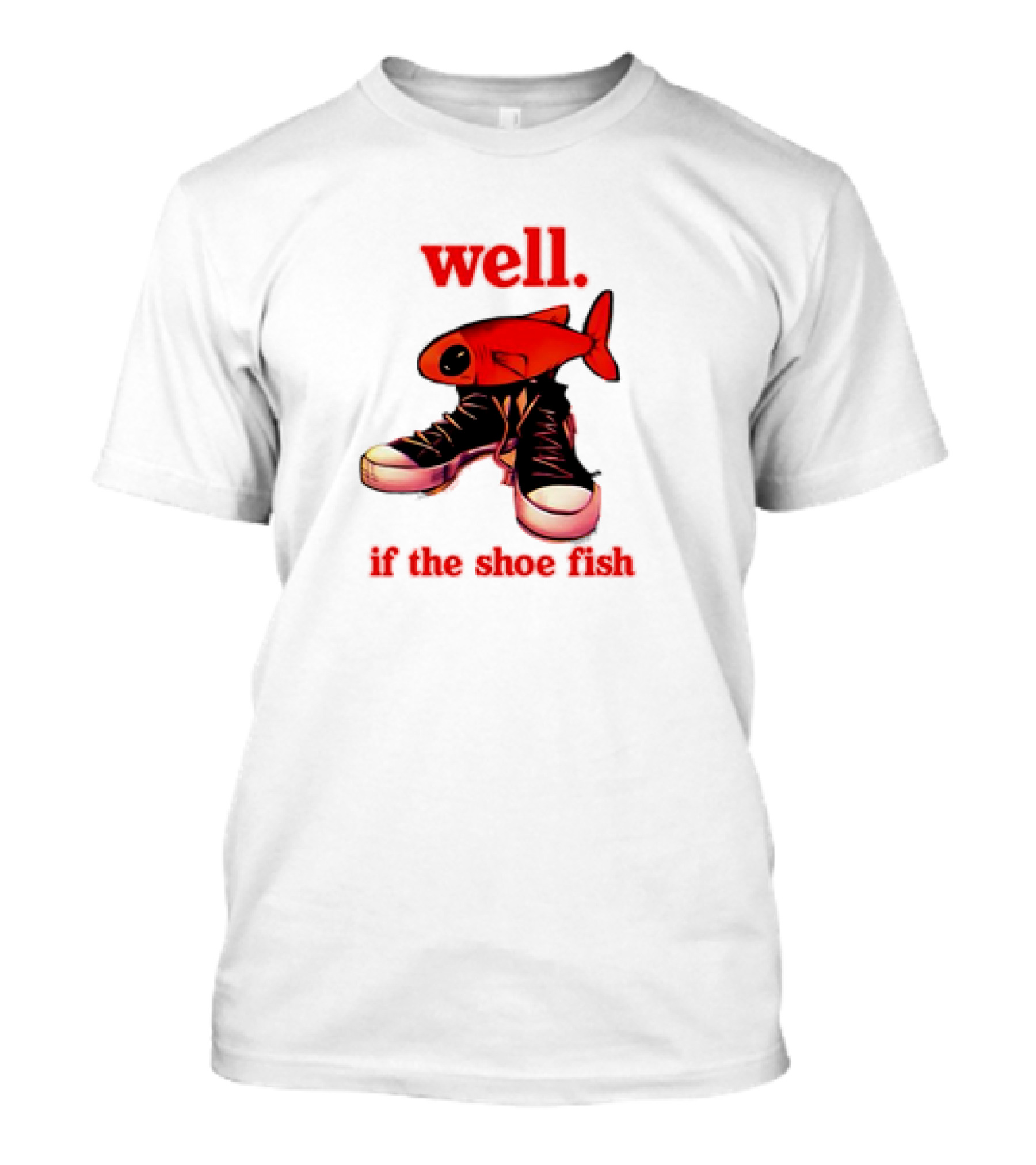 The Well If the Shoe Fish Meme Retro Style Sneakers Red Fish T-shirt is designed for everyday wear and a consistent fit. Fabric is pre-shrunk ring-spun cotton with durable stitching. See the size chart below for exact measurements.