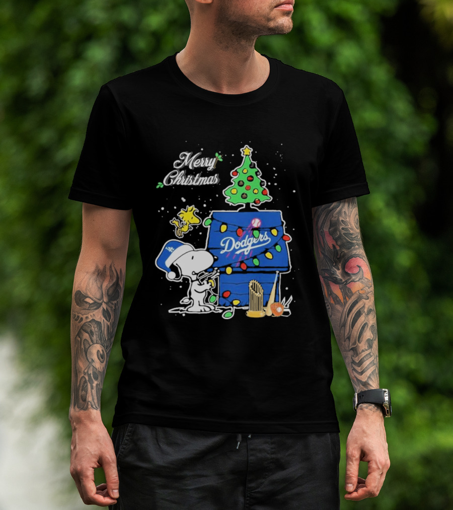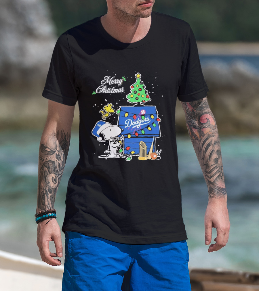 Merry Christmas Snoopy Los Angeles Dodgers Tree Lights Woodstock T-Shirt