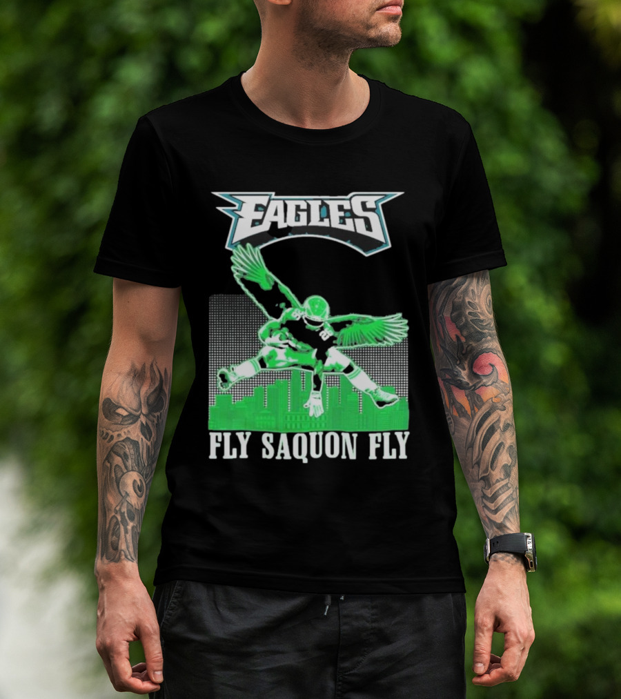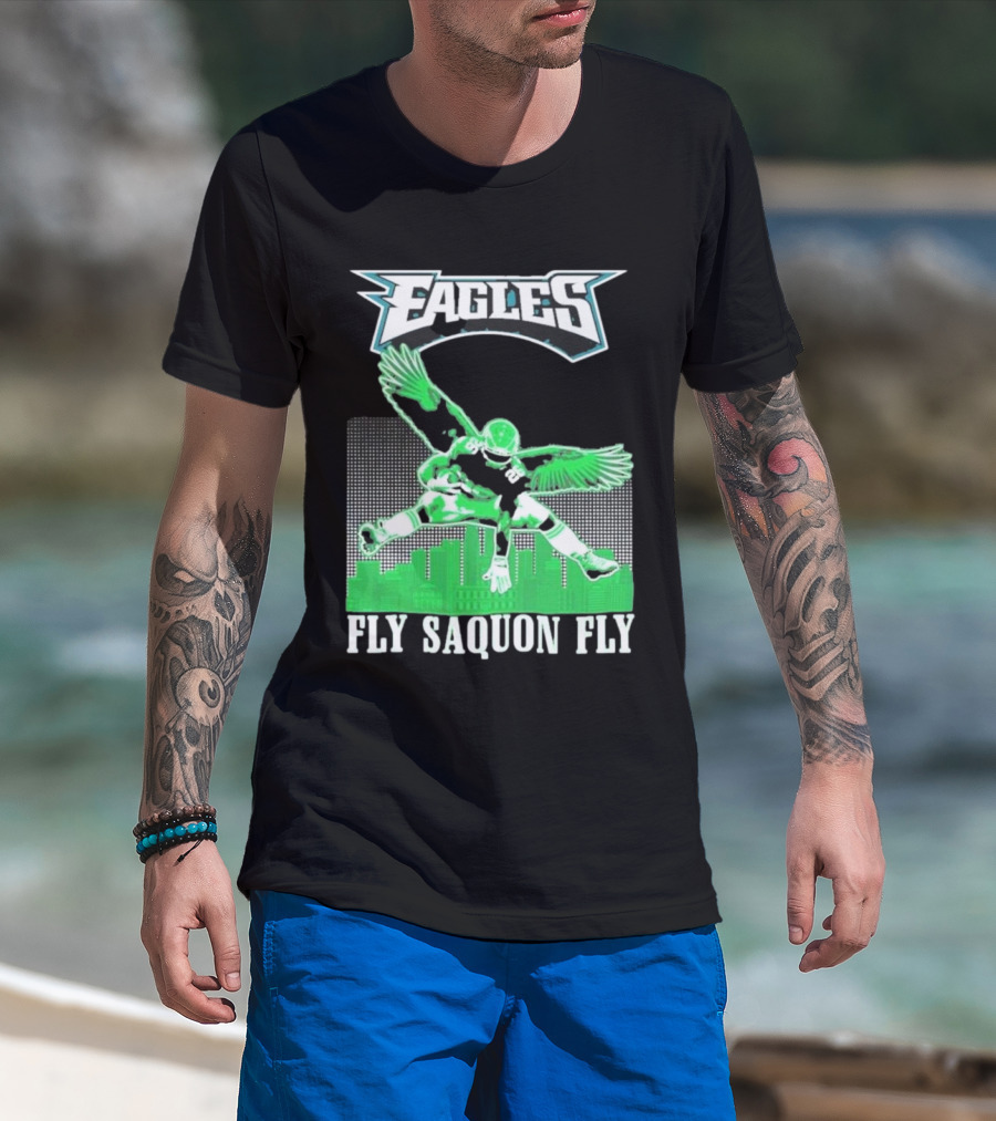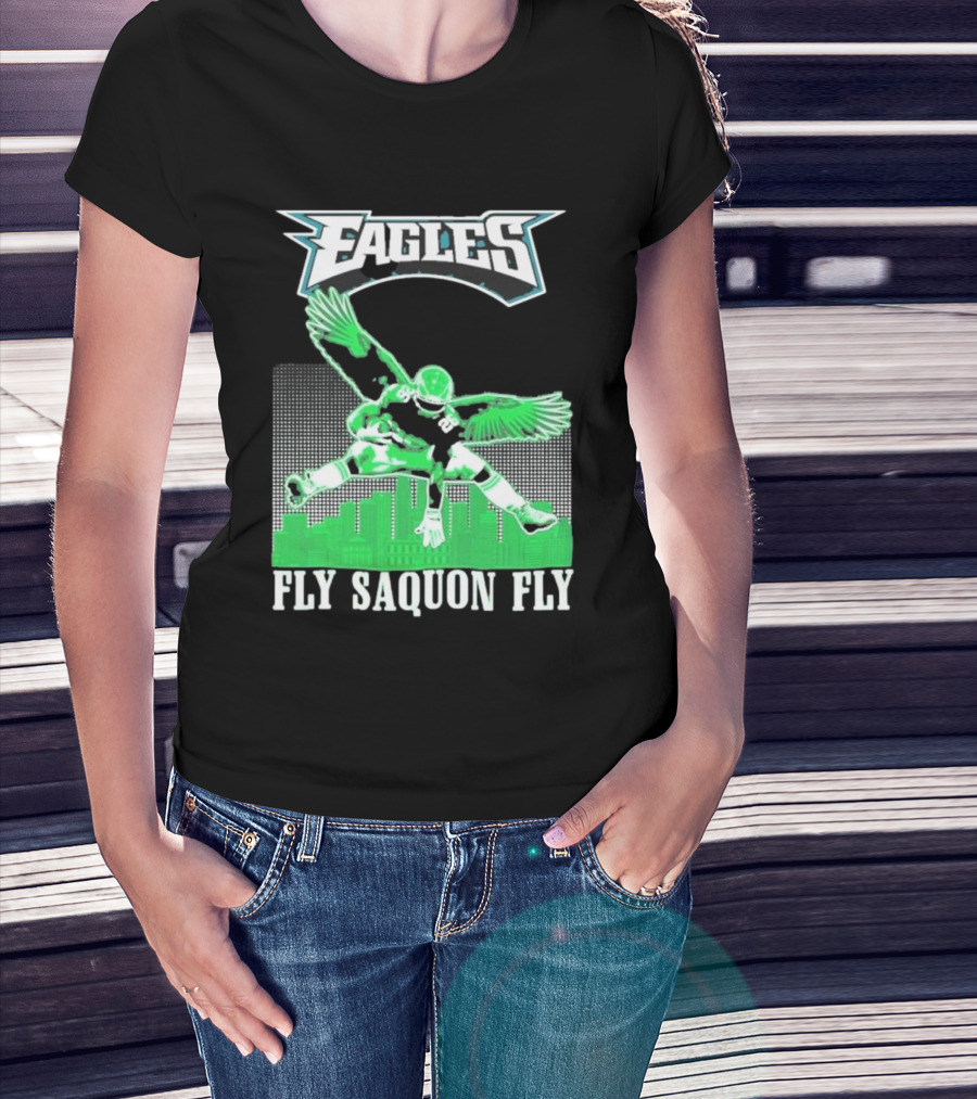 The Eagles Fly Saquon Fly T-shirt is designed for everyday wear and a consistent fit. Fabric is pre-shrunk ring-spun cotton with durable stitching. See the size chart below for exact measurements.