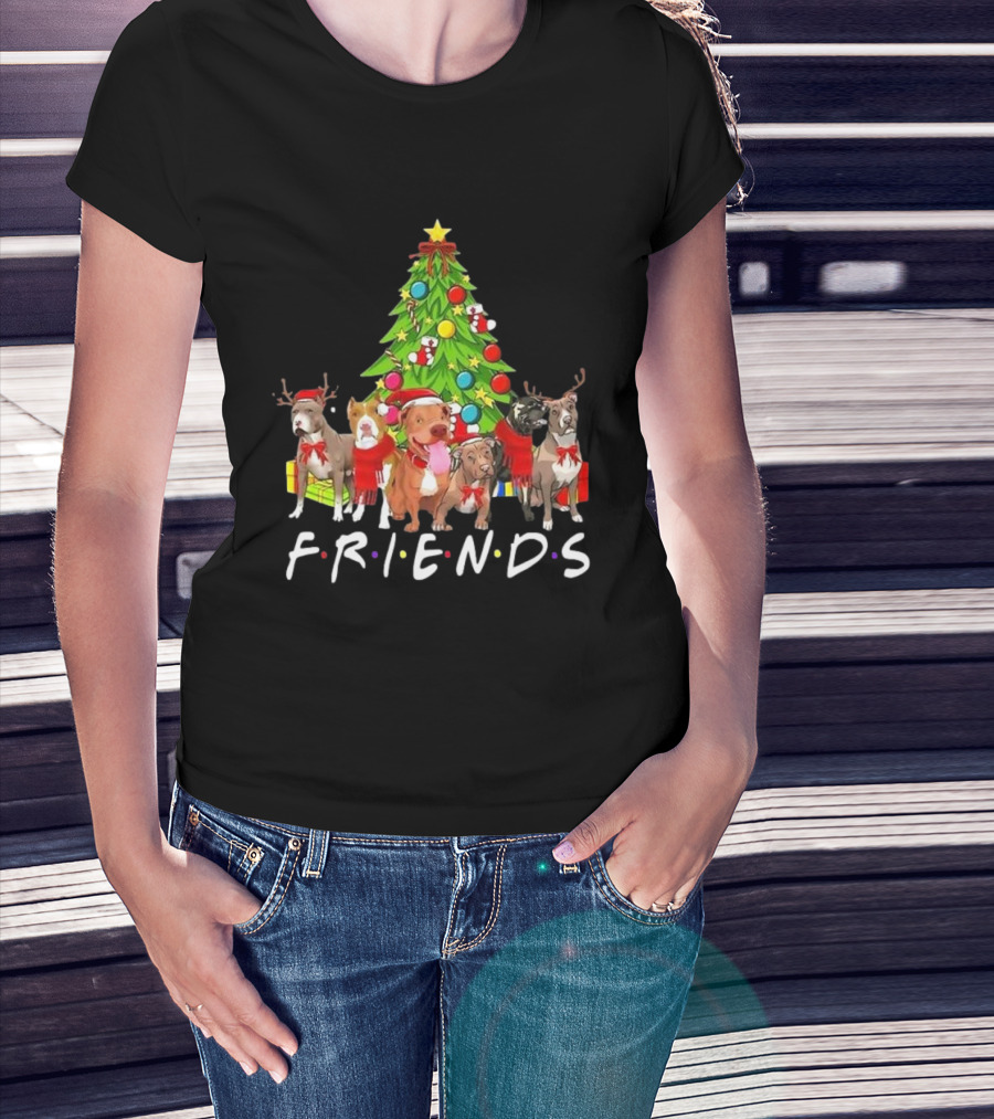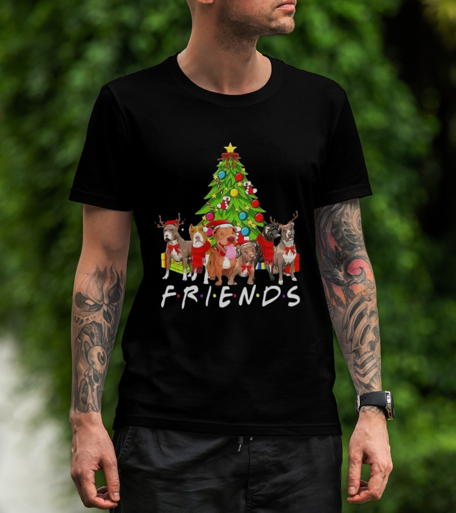 FRIENDS Christmas Tree With Pitbulls In Festive Scarf And Antlers T-Shirt