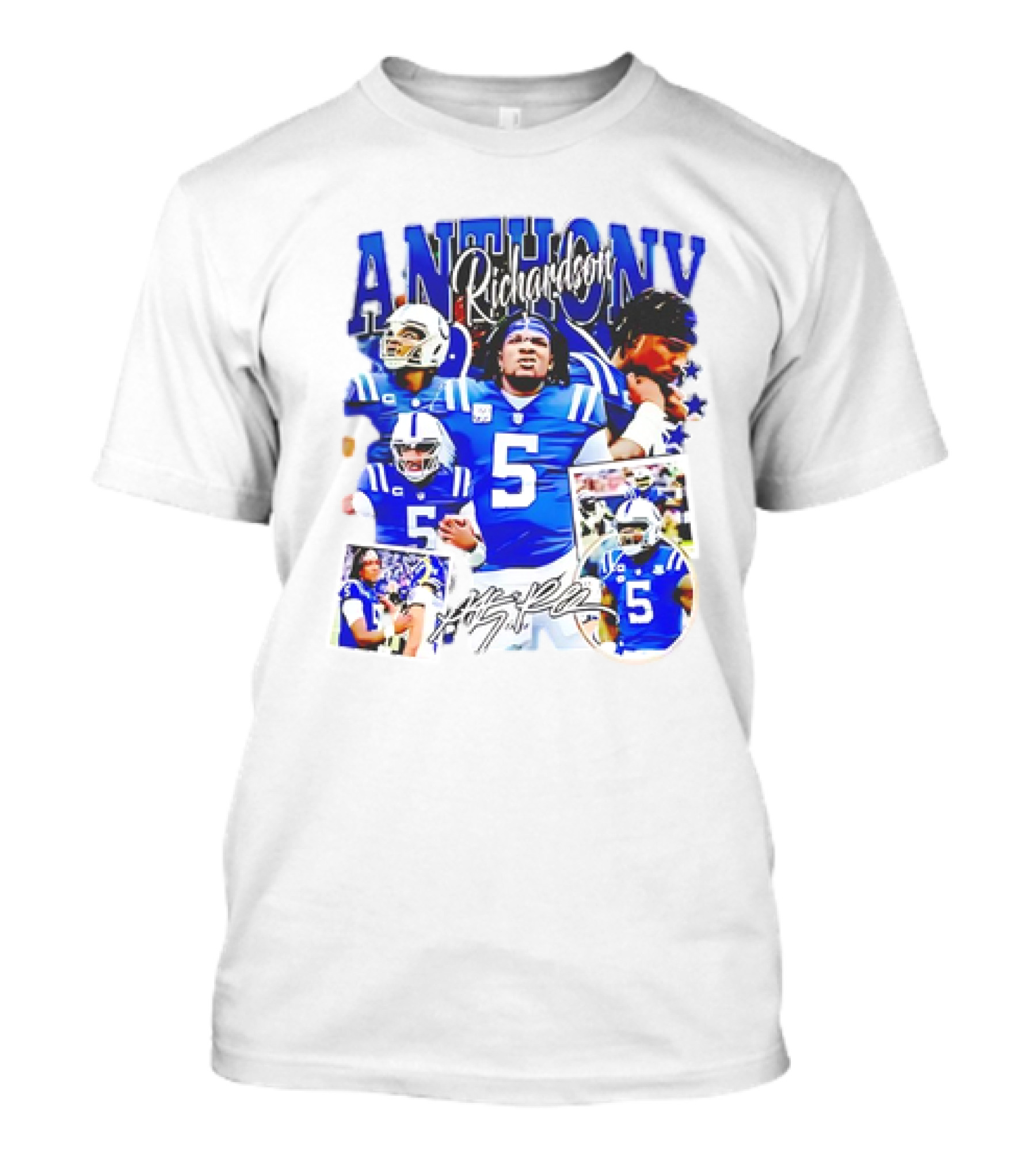 The Anthony Richardson Indianapolis Colts Number 5 Collage T-shirt is designed for everyday wear and a consistent fit. Fabric is pre-shrunk ring-spun cotton with durable stitching. See the size chart below for exact measurements.