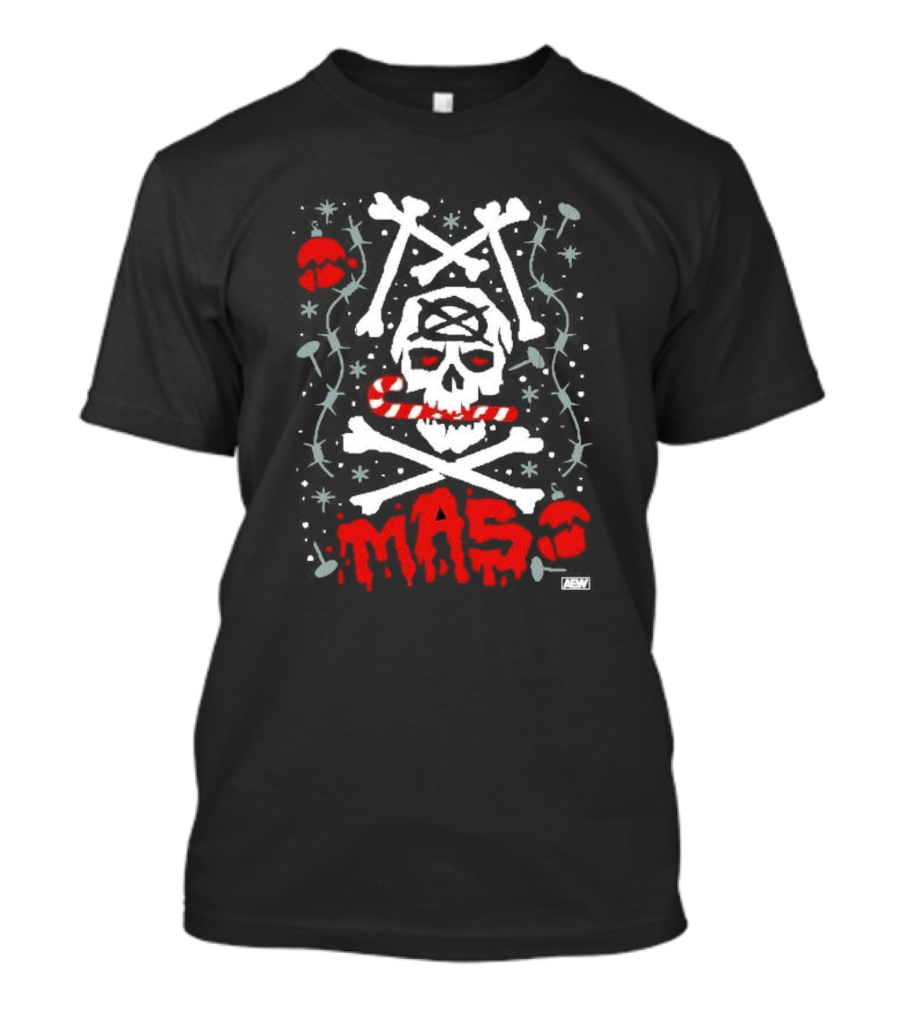 The Jon Moxley Xmas Skull Candy Cane Holiday AEW T-shirt is designed for everyday wear and a consistent fit. Fabric is pre-shrunk ring-spun cotton with durable stitching. See the size chart below for exact measurements.