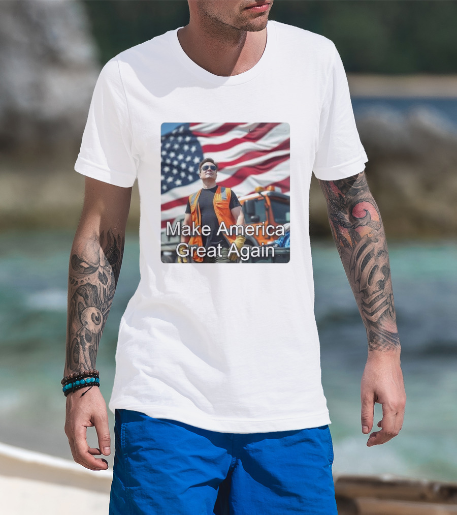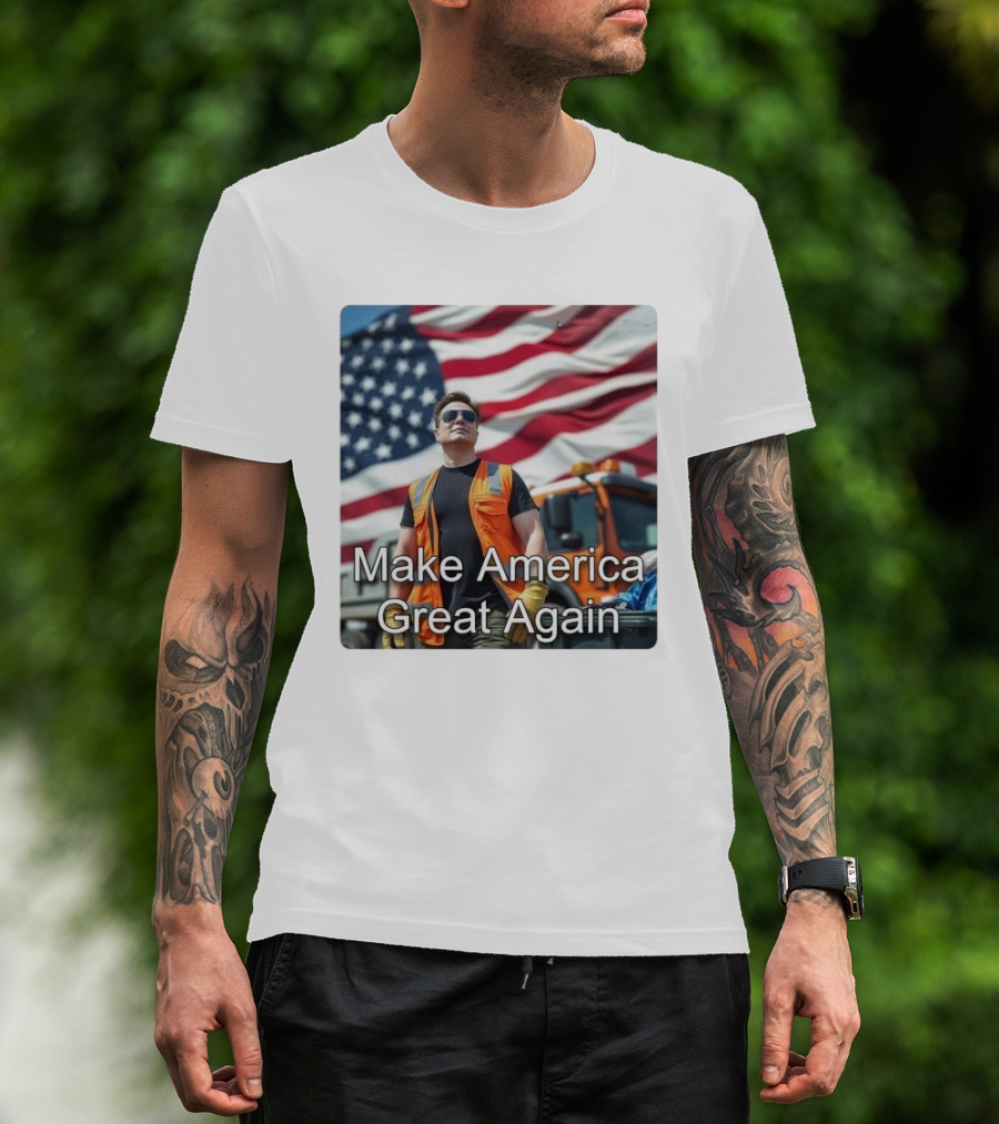 Make America Great Again Elon Musk In Orange Vest With American Flag Background T-Shirt