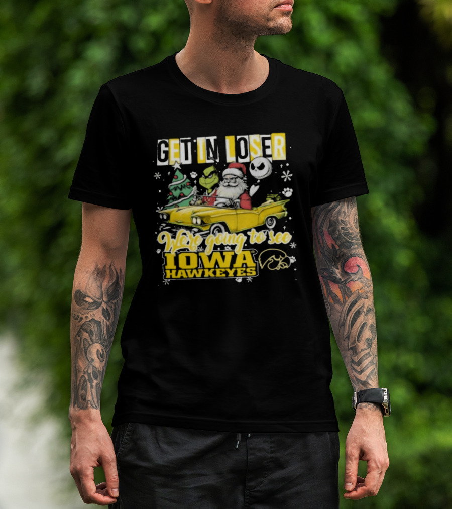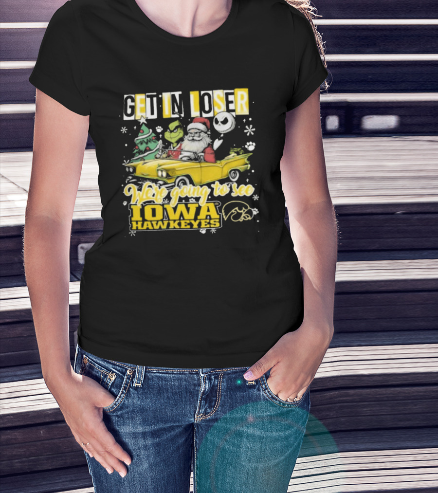 Get In Loser Santa Grinch Jack Skellington Driving To Iowa Hawkeyes Christmas T-Shirt