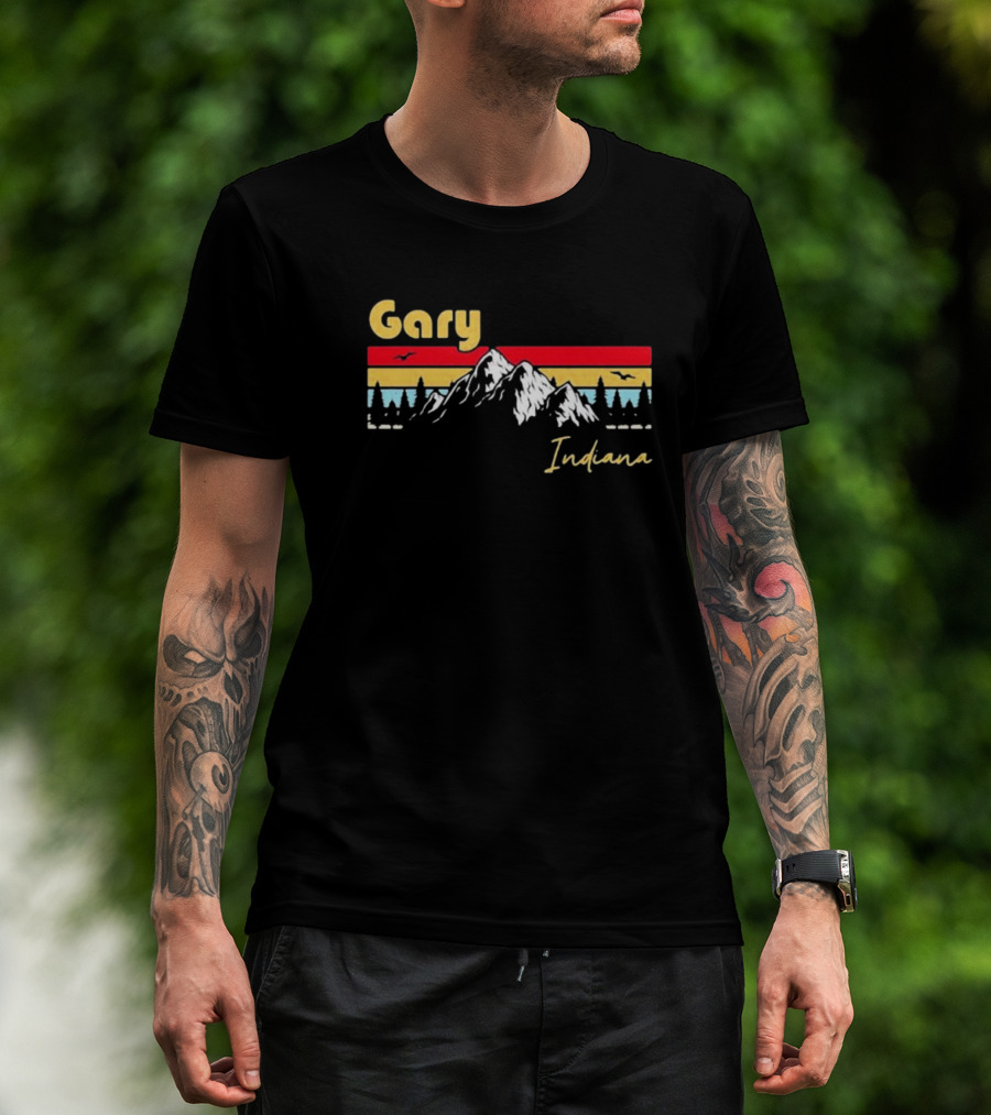 The Joseph Spooky Pete Gary Indiana Retro Hometown Roots Mountain Sunset T-shirt is designed for everyday wear and a consistent fit. Fabric is pre-shrunk ring-spun cotton with durable stitching. See the size chart below for exact measurements.