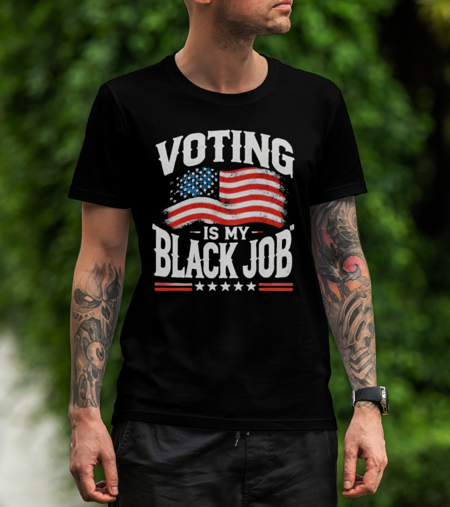 The Voting Is My Black Job American Flag Vote T-shirt is designed for everyday wear and a consistent fit. Fabric is pre-shrunk ring-spun cotton with durable stitching. See the size chart below for exact measurements.