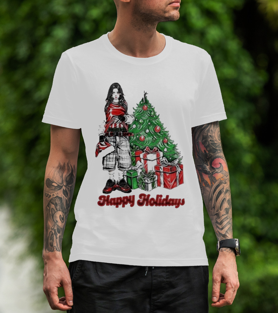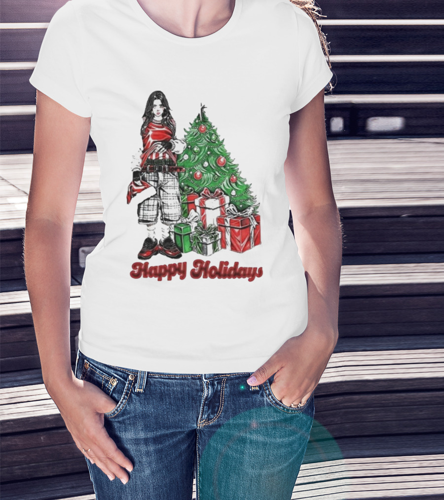 The Billie Eilish Happy Holidays Christmas Tree Presents T-shirt is designed for everyday wear and a consistent fit. Fabric is pre-shrunk ring-spun cotton with durable stitching. See the size chart below for exact measurements.