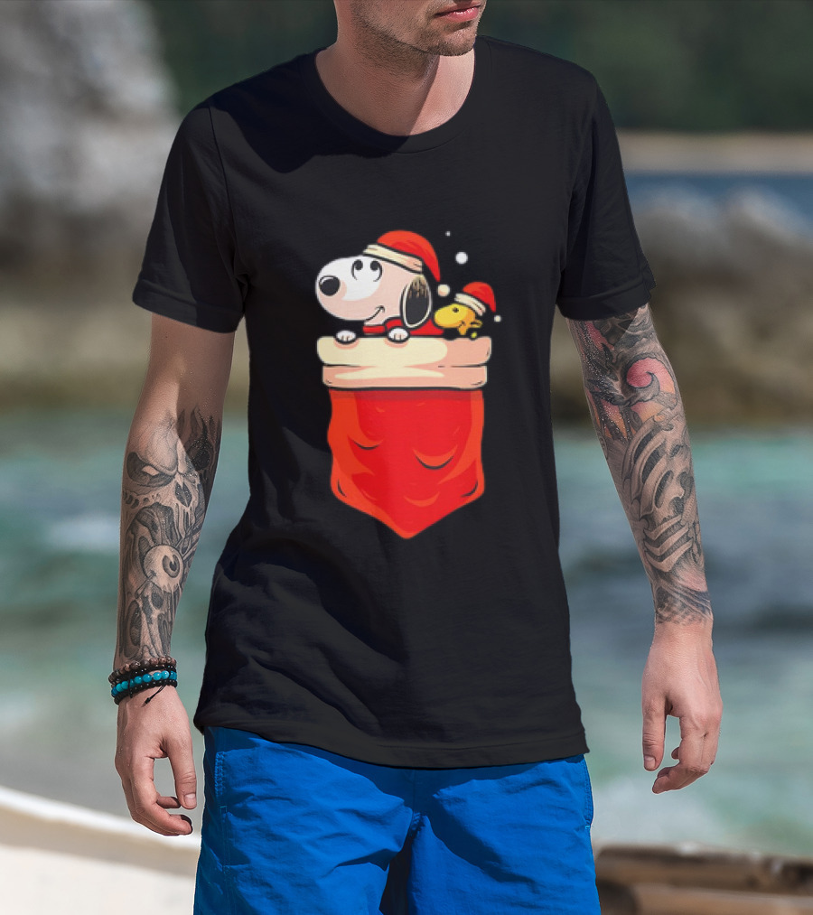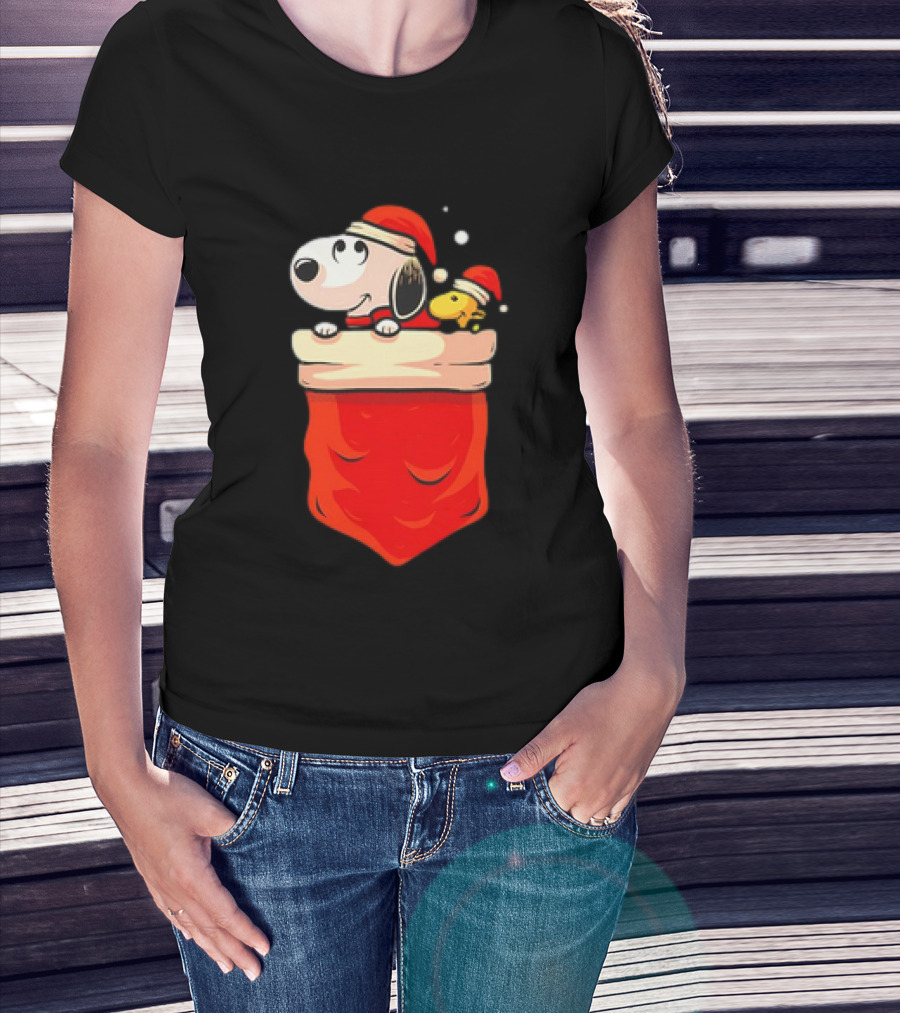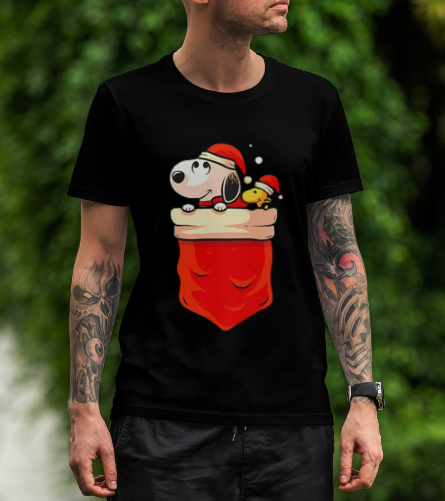 Snoopy And Woodstock Christmas Santa Hats In Red Pocket T-Shirt