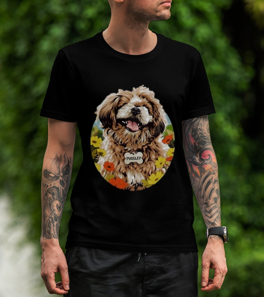 The Pugsley Dog Floral Nordacious T-shirt is designed for everyday wear and a consistent fit. Fabric is pre-shrunk ring-spun cotton with durable stitching. See the size chart below for exact measurements.