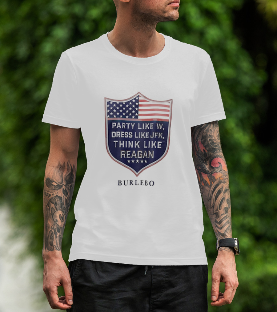 Party Like W Dress Like JFK Think Like Reagan Burlebo Shield With American Flag T-Shirt