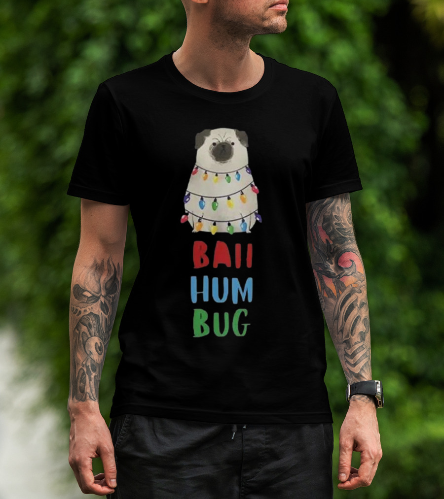 Vito The Pug Wrapped In Christmas Lights Bah Hum Bug T-Shirt