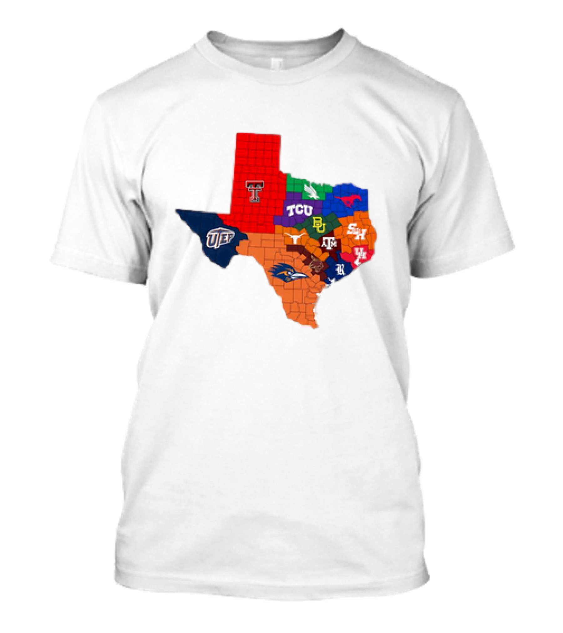 The Texas College Football Teams Map with Logos Including Texas Tech TCU SMU Baylor Texas A&M UTEP SHSU UTSA T-shirt is designed for everyday wear and a consistent fit. Fabric is pre-shrunk ring-spun cotton with durable stitching. See the size chart below for exact measurements.