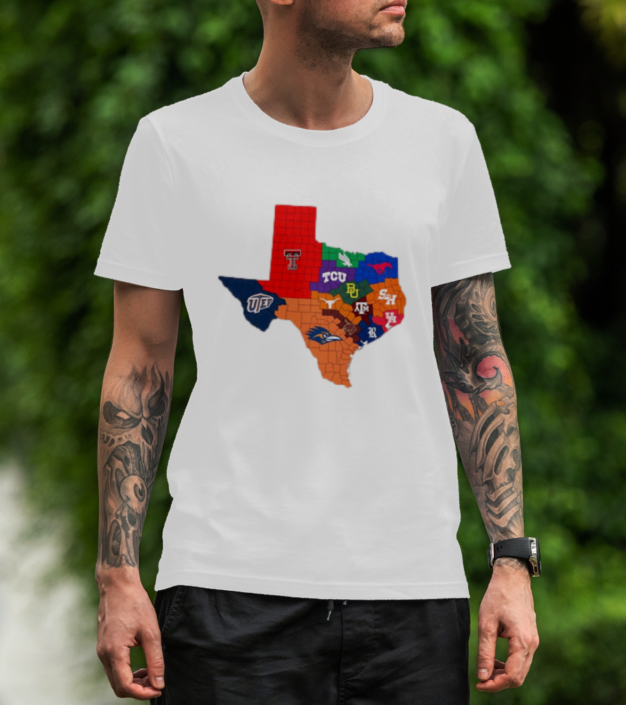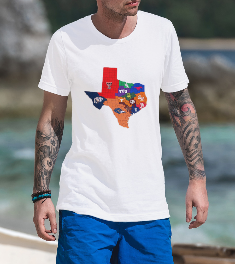 Texas College Football Teams Map With Logos Including Texas Tech TCU SMU Baylor Texas A&M UTEP SHSU UTSA T-Shirt