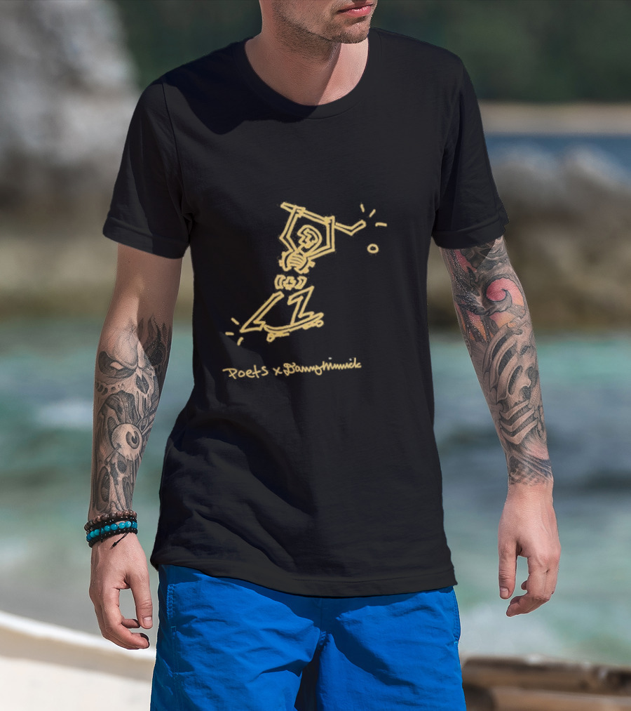 The Poets X Danny Minnick Skateboard Skeleton Gold Print T-shirt is designed for everyday wear and a consistent fit. Fabric is pre-shrunk ring-spun cotton with durable stitching. See the size chart below for exact measurements.