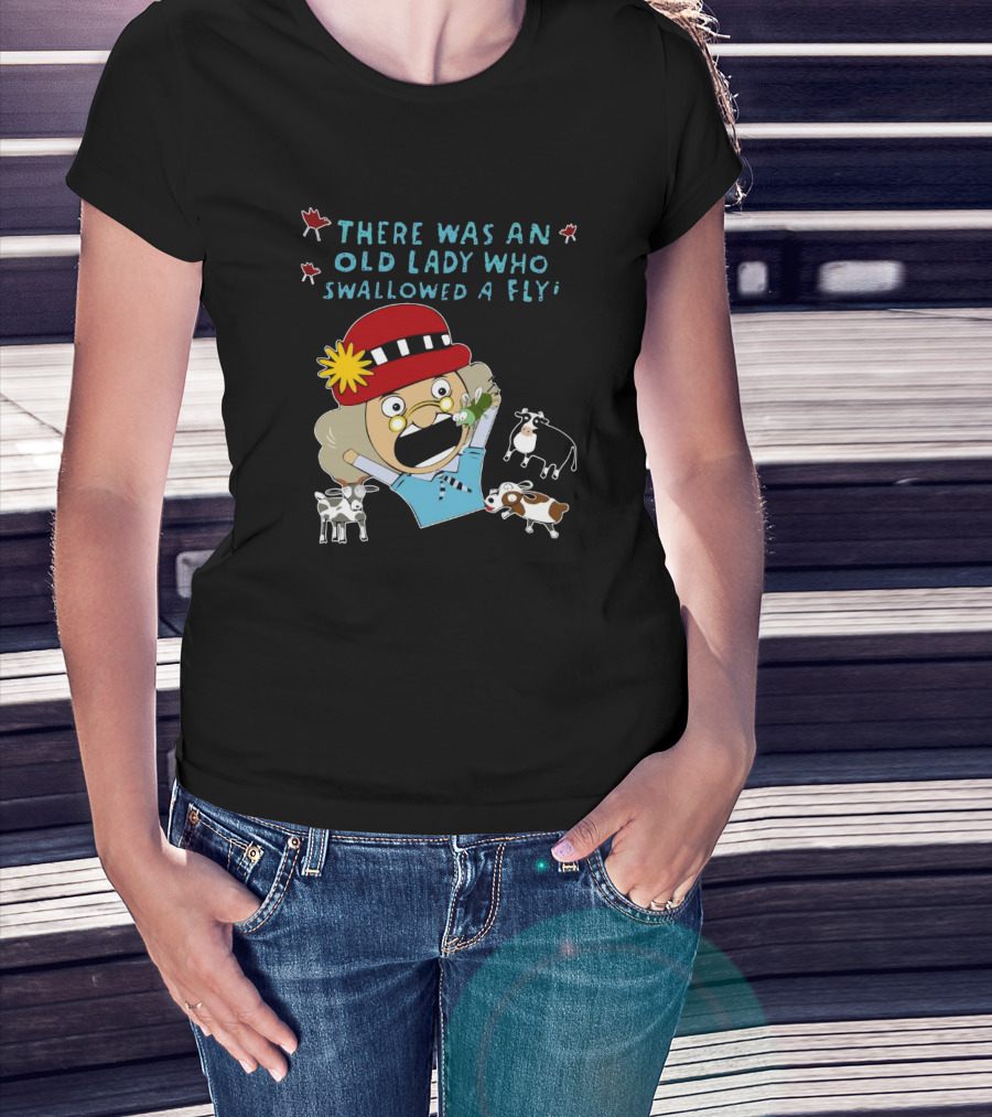 There Was An Old Lady Who Swallowed A Fly Black Funny Cartoon With Animals T-Shirt