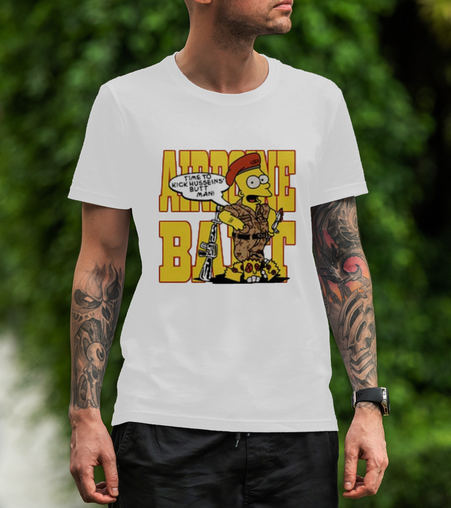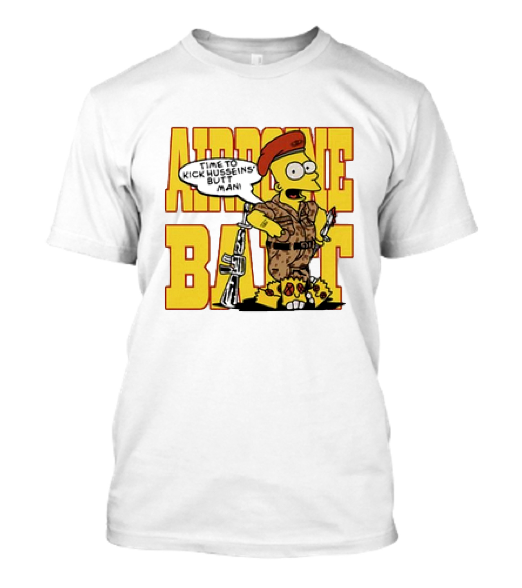 The Bart Simpson Airborne Time to Kick Husseins’ Butt Man T-shirt is designed for everyday wear and a consistent fit. Fabric is pre-shrunk ring-spun cotton with durable stitching. See the size chart below for exact measurements.