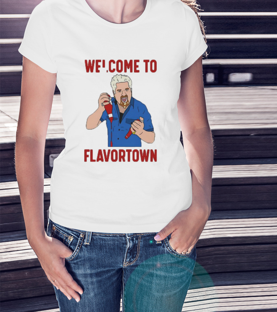 WECOME TO FLAVORTOWN Flavortown Guy Character Cartoon Blue Shirt Red Bottles T-Shirt