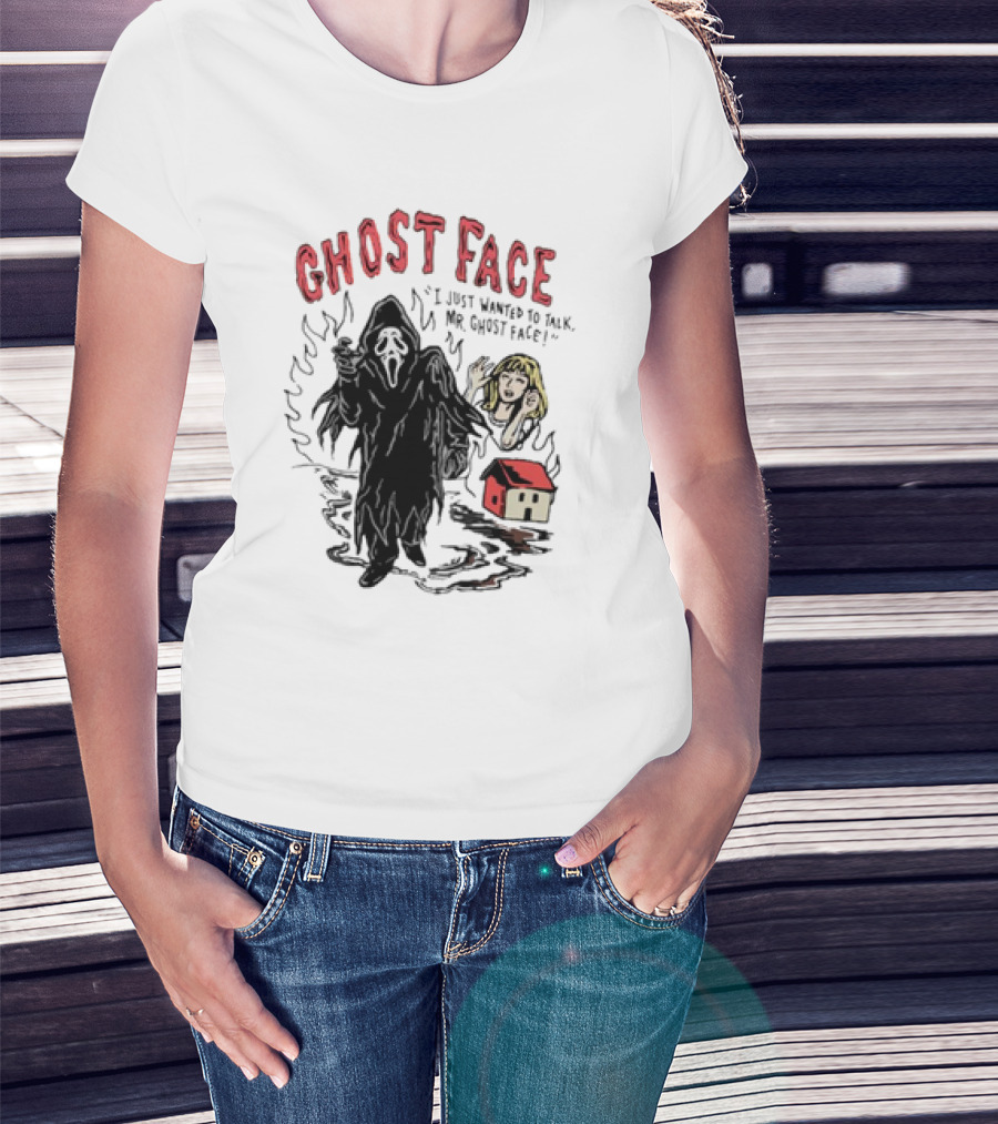 Ghostface I Just Wanted To Talk Mr Ghostface With Haunted House And Frightened Woman T-Shirt