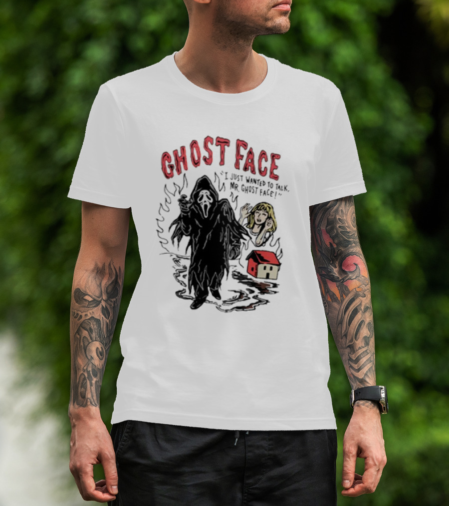 The Ghostface I Just Wanted to Talk Mr Ghostface with Haunted House and Frightened Woman T-shirt is designed for everyday wear and a consistent fit. Fabric is pre-shrunk ring-spun cotton with durable stitching. See the size chart below for exact measurements.