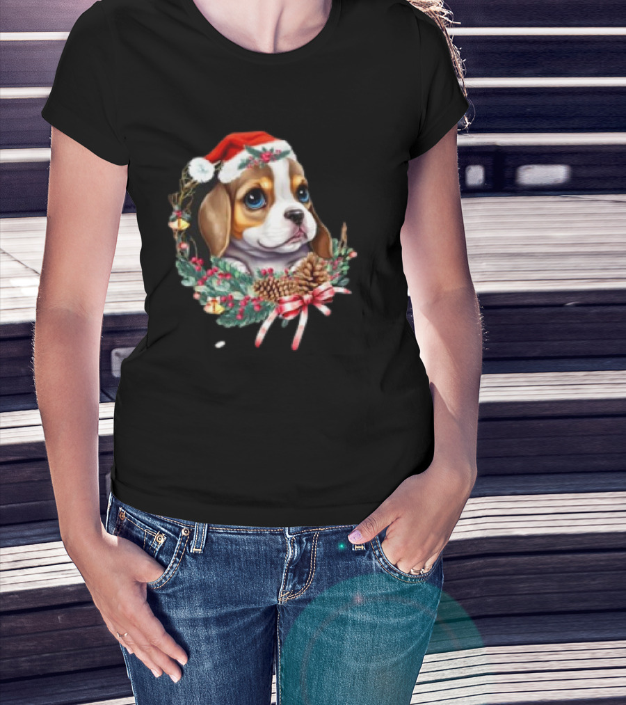 Christmas Beagle With Santa Hat And Holiday Wreath T-Shirt